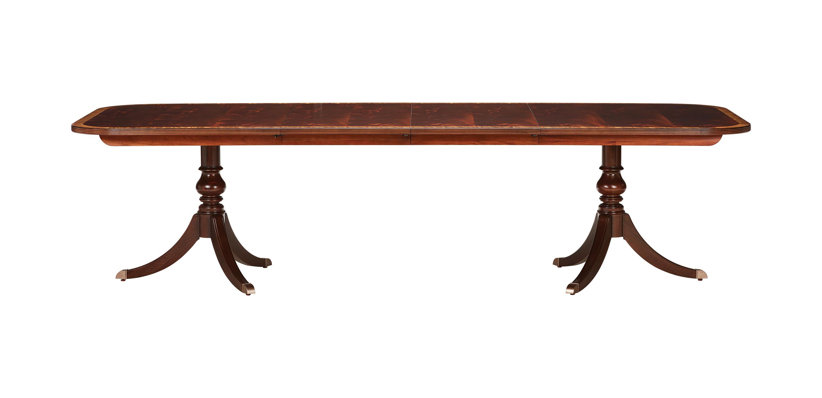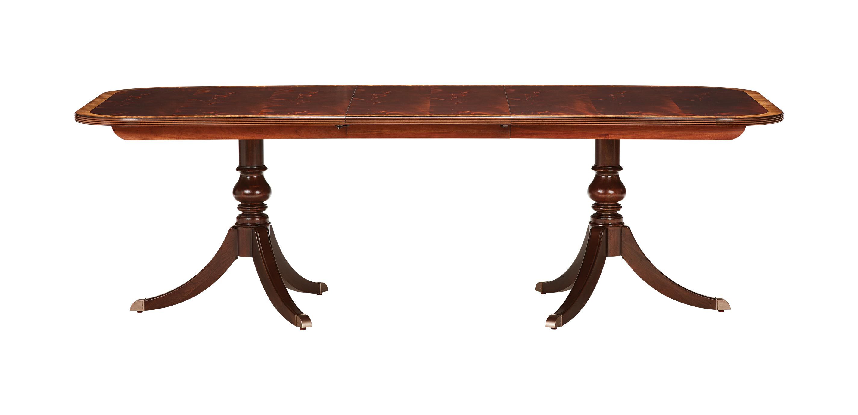 Abbott weaves modern livability into classic Sheraton styling. Unique pedestals rest on handsome sabre legs; an ornate top sets the scene for fine dining. Classic Sheraton-style double pedestal dining table Crafted from primavera and swirl mahogany veneers* Top: select slip-matched swirl decorative veneers with decorative black inlay around perimeter Feet feature nickel-plated ferrules Opens to 118"l x 46"w with two 22" leaves Available in Belmont (570) finish This tabletop is one of a kind, made from wood that possesses inherent natural variations. No two are alike.