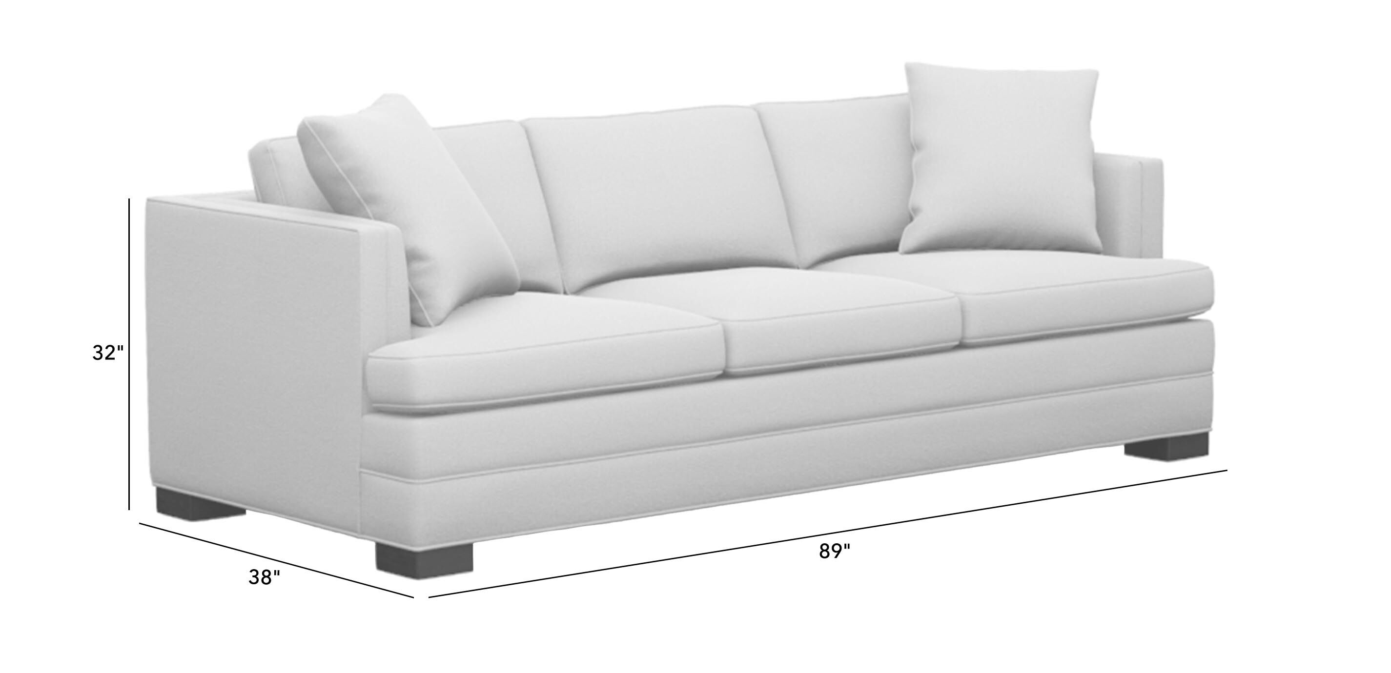 Hand-tailored in North America by Ethan Allen artisans Because our upholstery is tailored by hand—manually cut, sewn, and fitted to each frame—dimensions may vary slightly from piece to piece; dimensions listed have been rounded up to the next whole inch Interior Seating Area: 202452 80" Sofa: 68"w x 20"d 202453 89" Sofa: 77"w x 20"d Seat back: 13"h Seat height (floor to top of cushion): 19" Arm height: 27" Packaged weight: 212 lbs.