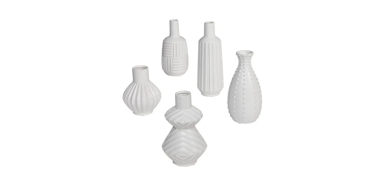 A white ceramic vase is pretty when empty, beautiful when it’s holding a single bud. Lovely by itself, it’s even more elegant in the company of others like it. We saved you the time and trouble of finding five amicable vases—and they practically arrange themselves! Made of porcelain and finished with a matte white glaze, this unique ceramic vase set adds depth, dimension, and balance to any surface in your home.