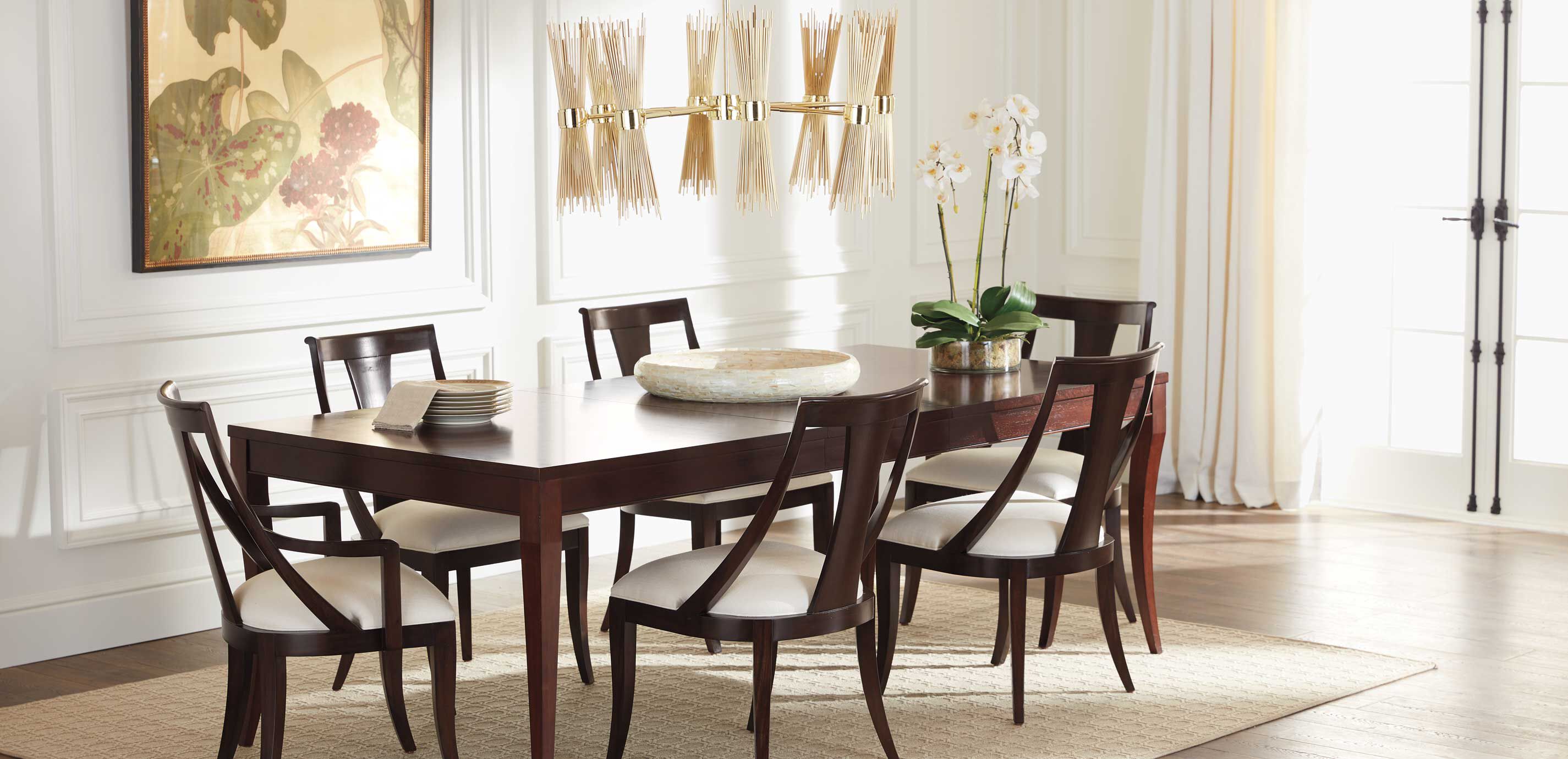 This stunning dining table will turn heads in your home. Precise lines, an exotic wood finish, and graceful saber legs come together elegantly in a chic transitional design that's simply beautiful. Crafted from mozambique and mahogany veneers with Indonesian mahogany solids* Opens to 108" with two 18" leaves, seats up to 10 Traditional design with updated, modern styling and saber-shaped legs Legs and aprons are complemented with a contrasting, decorative Mozambique veneer tabletop Available in Citrine (321), an on-trend finish that coordinates beautifully with our other dining furniture. Citrine is a cool brown stain with natural variations. Order a finish sample: Citrine (321)