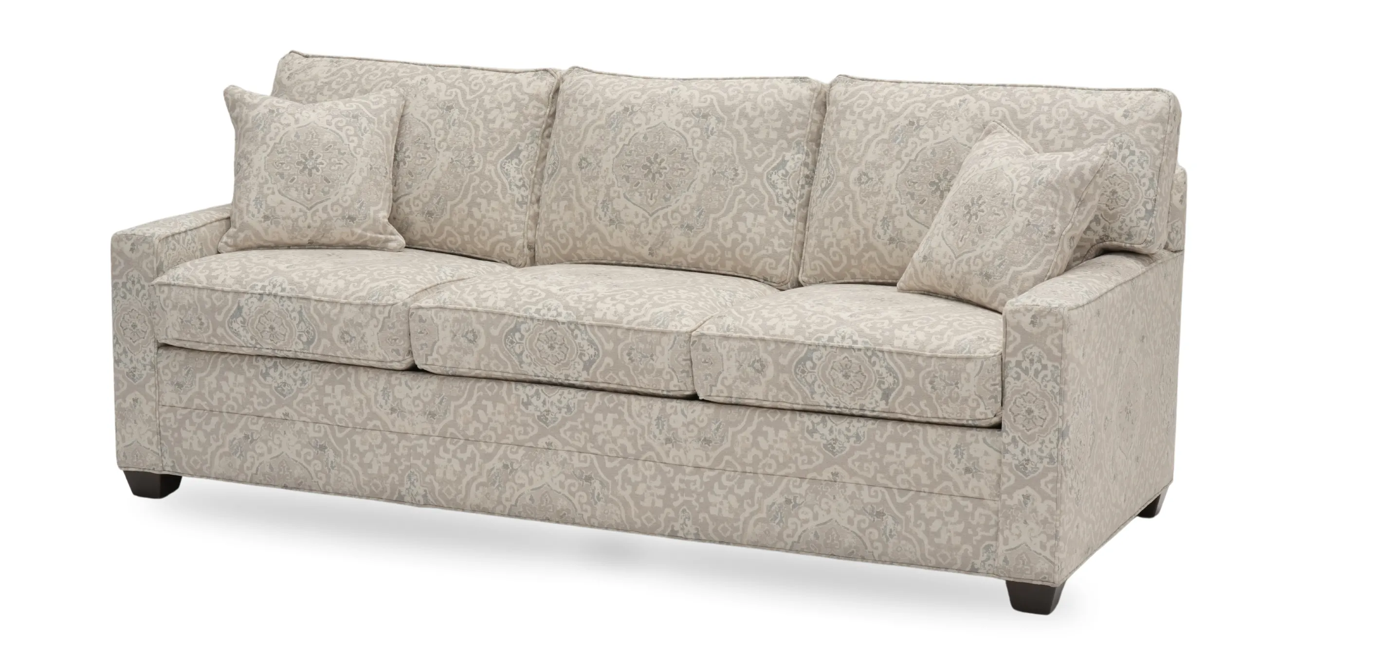 Tailored by hand over a durable engineered wood frame. Two 17" pillows included; optional nailhead available in Design Centers.