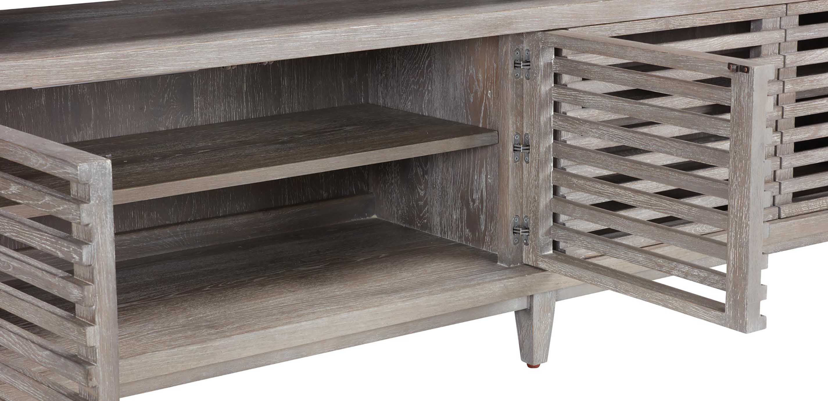Our modern midcentury Braswell entertainment cabinet was made for the here and now. Horizontal slats create visual appeal and allow remote controls to do their work --- without you having to open the doors! Midcentury-inspired media cabinet crafted from solid oak with select oak veneers* Remotes can be used without having to open slatted doors One adjustable shelf per side Recessed support for sound bar storage Modern mid-century design crafted from solid oak with select oak veneers Available in Rustic Light Brown (491), Rustic Gray (493) and Rustic Sable (497) finishes