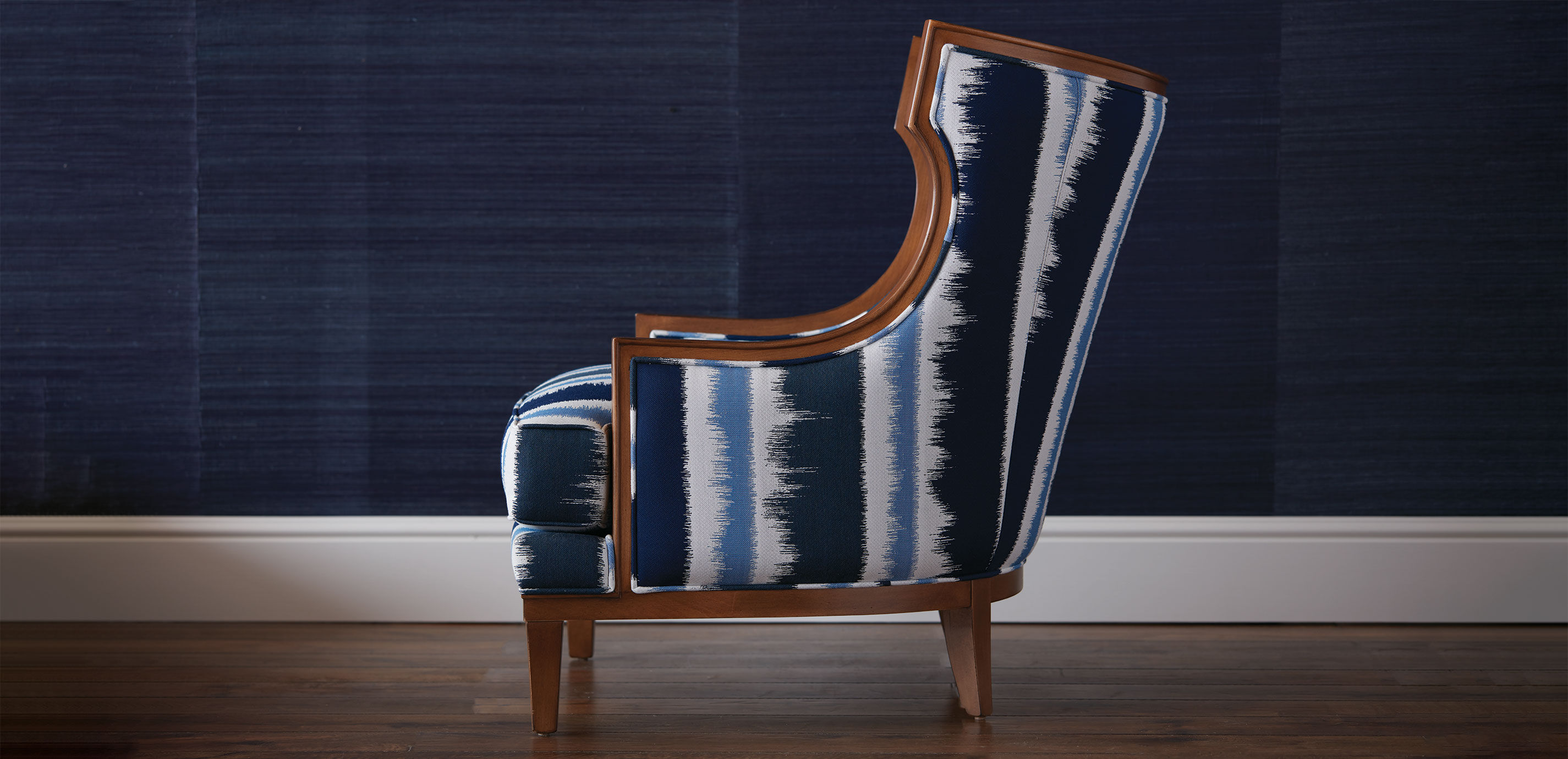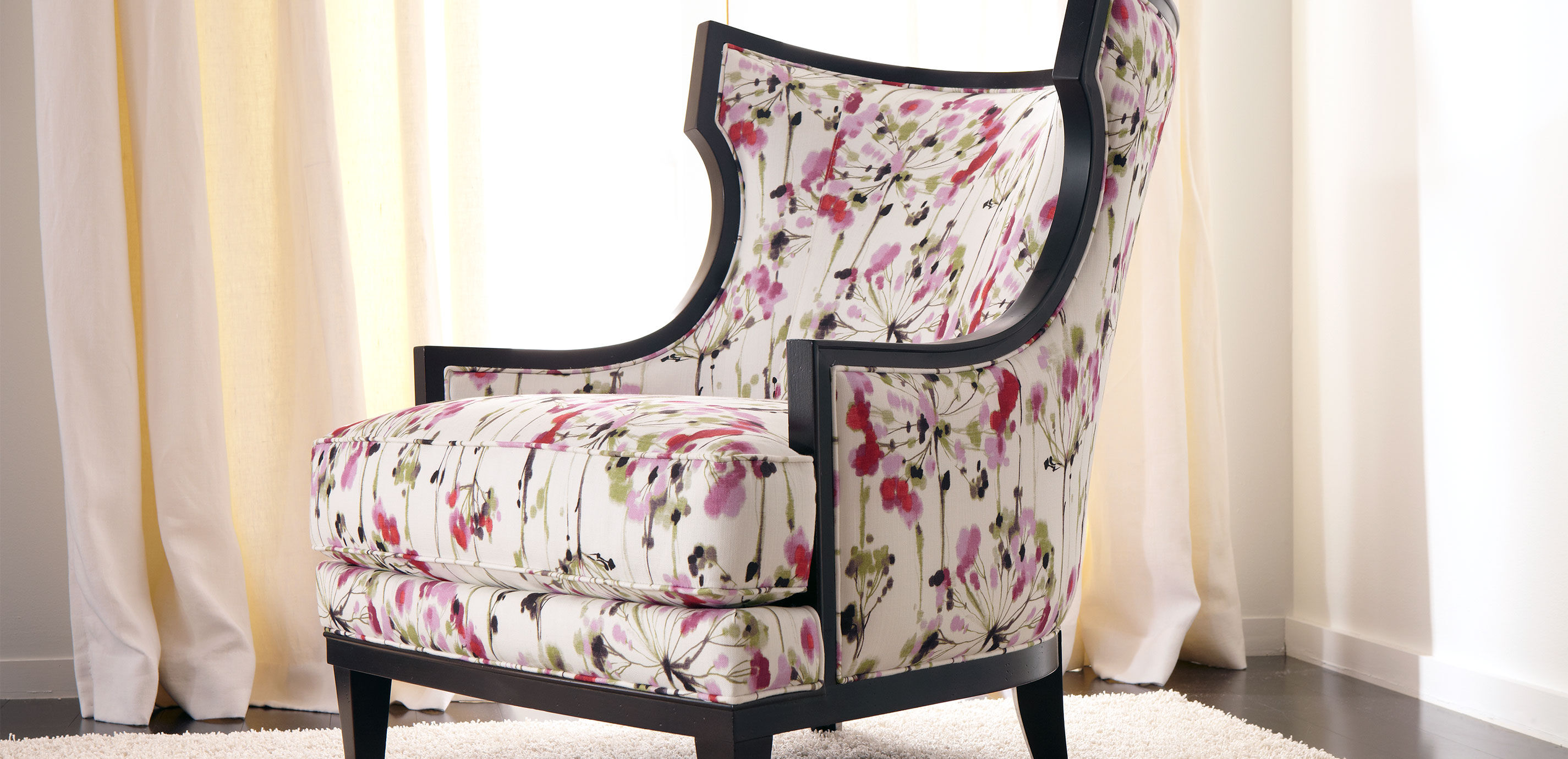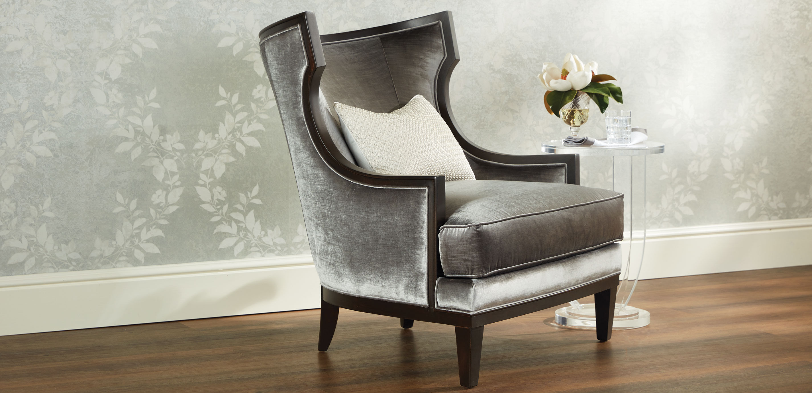 Classic klismos design meets timeless wing chair style on a bold scale. Corrine is a delight from every angle with its exposed curved wood trim, matching legs, contoured tight back, and deep cushioned seat.