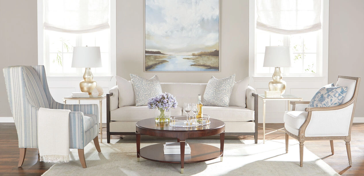 The Elton round coffee table blends a streamlined Regency-inspired form with neoclassical details