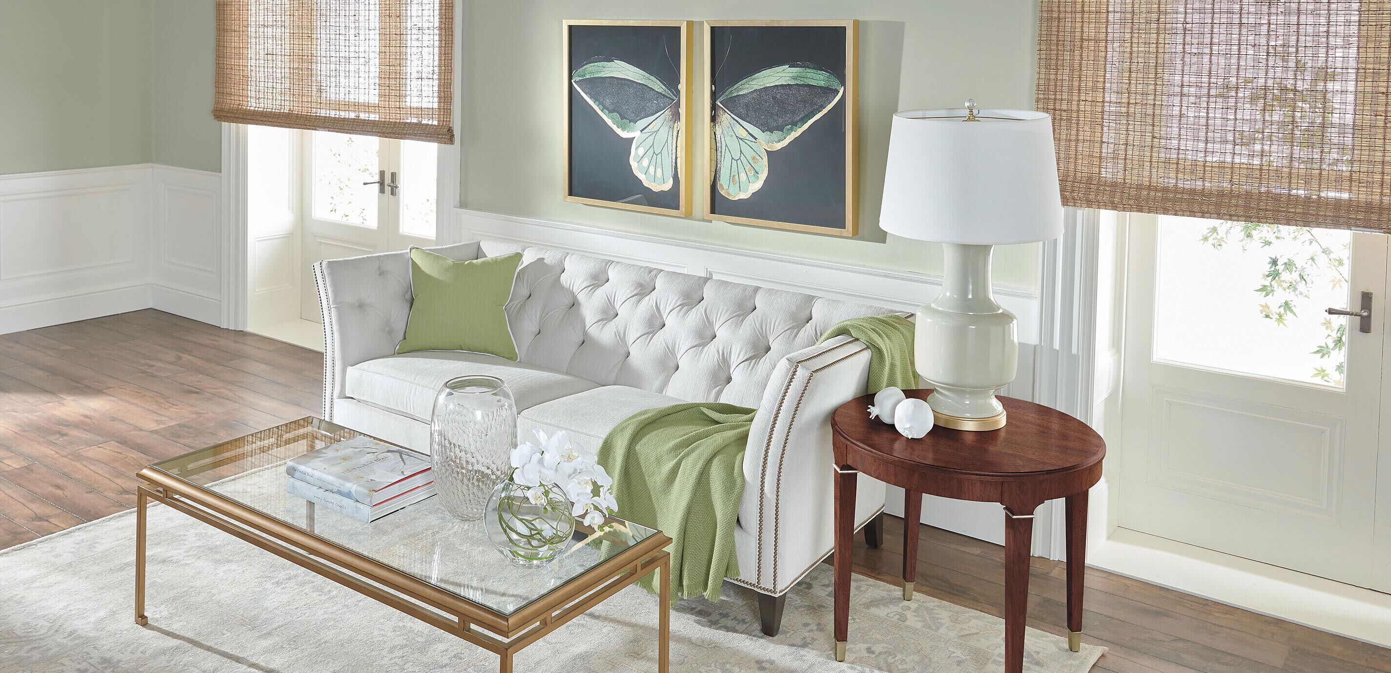 Sunburst-patterned walnut veneers draw all eyes toward whatever precious items you display atop your Elton end table. The look is made complete by hand-painted satin gold rings and Satin Gold steel ferrules on its legs that borrow their understated elegance from Regency-era furniture design. The Elton end table blends a streamlined Regency-inspired form with neoclassical details Crafted from Indonesian mahogany and cathedral walnut veneers* Satin Gold (10G) steel ferrules and satin gold-painted collar details adorn each leg Available in Modern Walnut (330) and Shale (380) Finish samples will be available soon. Please contact a Designer to learn more. Coordinates with the Elton Rectangular Coffee Table, Elton Round Coffee Table, and Elton Square Coffee Table