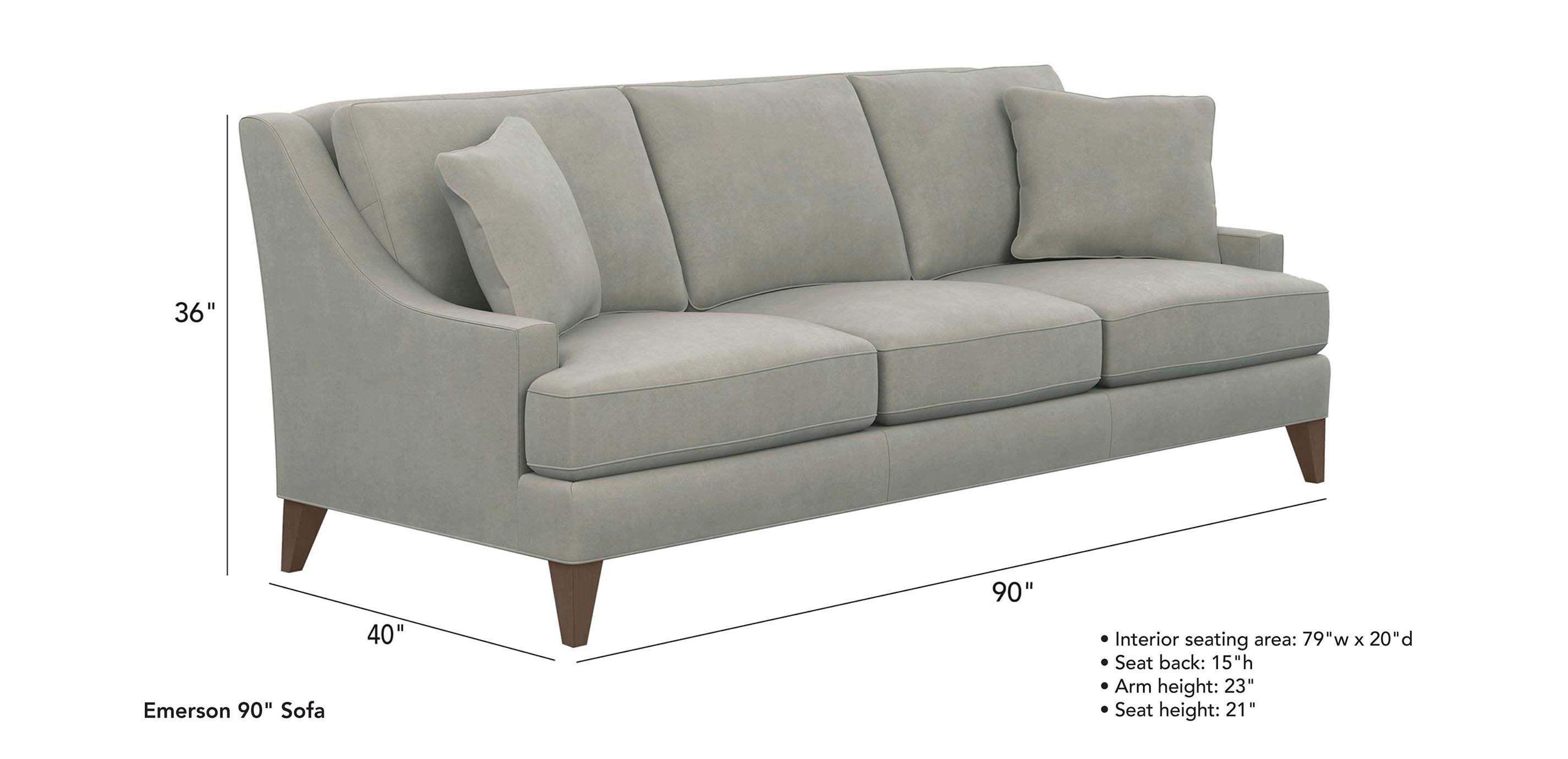 Regency-style sloped arms. Clean lines. Tapered legs. Loose pillow backs and T-shaped cushions. Emerson is effortlessly elegant. Tailored by hand in our North American workshops, it's available with custom options galore, including your choice of leather, fabric, nailhead trim, cushion fill, and leg finish. Sloped arms combined with loose welted back cushions and T-cushions make Emerson effortlessly elegant Our standard high-quality foam and fiber cushions along with two 19" toss pillows provide lasting comfort and style versatility. Visit a Design Center for additional options. Engineered panel frame for superior strength and long-lasting durability Legs finished in Raisin (939), a rich, cool dark brown water-based finish Stain-resistant fabric prevents damage from spills; great choice for homes with families and pets Also available in leather The fabrics and finishes shown here are our most popular, but if you don't see what you're looking for, visit a Design Center