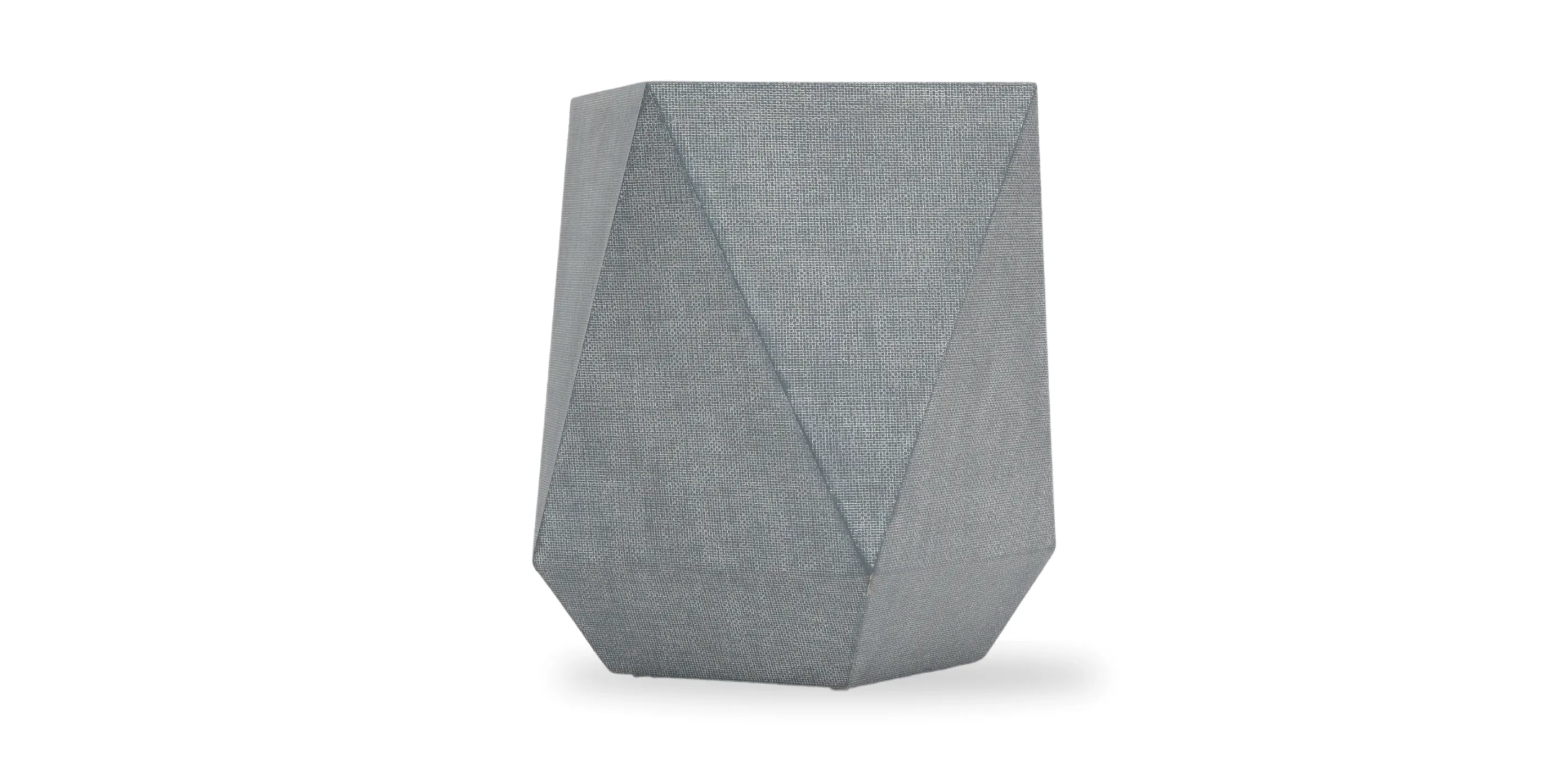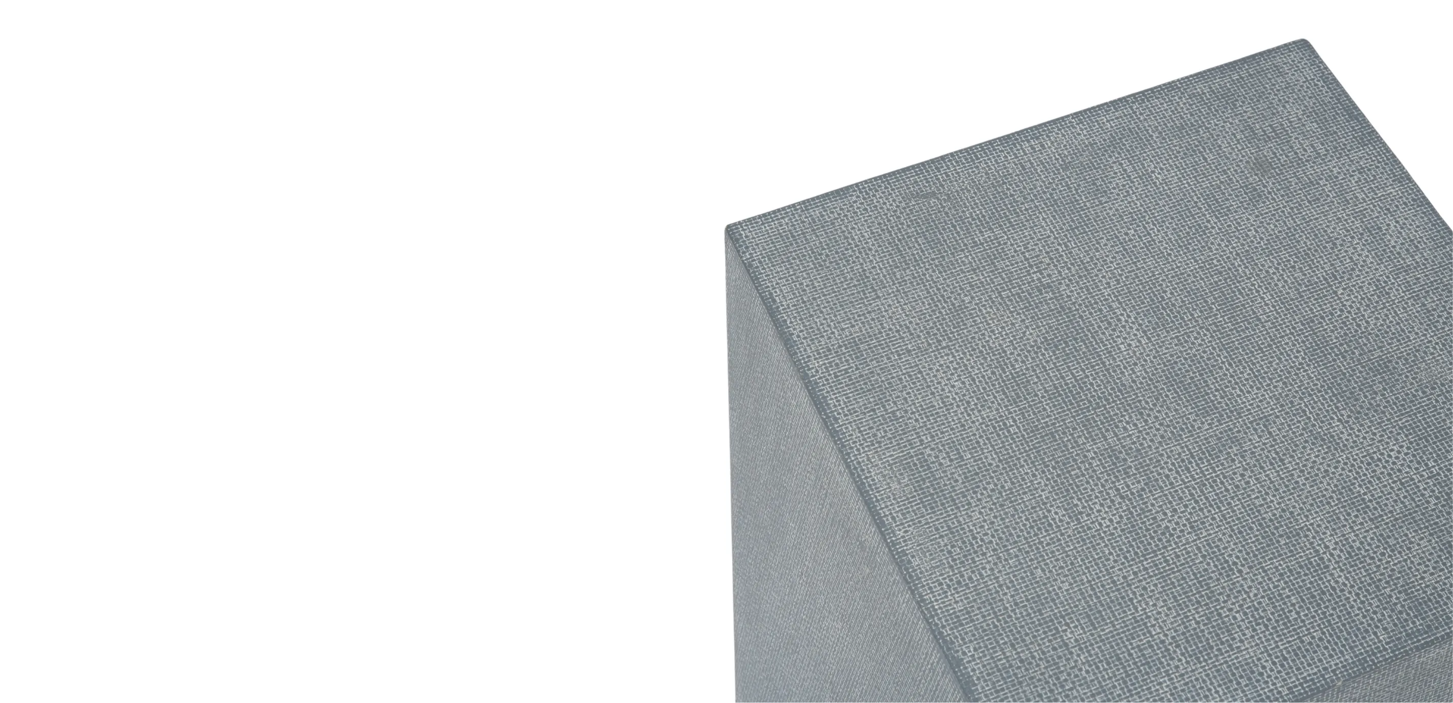 The Pamille Accent Table features a contemporary spin on a geometric shape. The solid plywood frame is wrapped in a tightly woven raffia material and finished in a soft slate blue. Raffia is a palm tree native to tropical Africa and Madagascar. It has a short trunk and leaves that may grow up to 60 feet long. The fiber from the raffia leaves is traditionally used for making items such as hats, baskets, and mats.