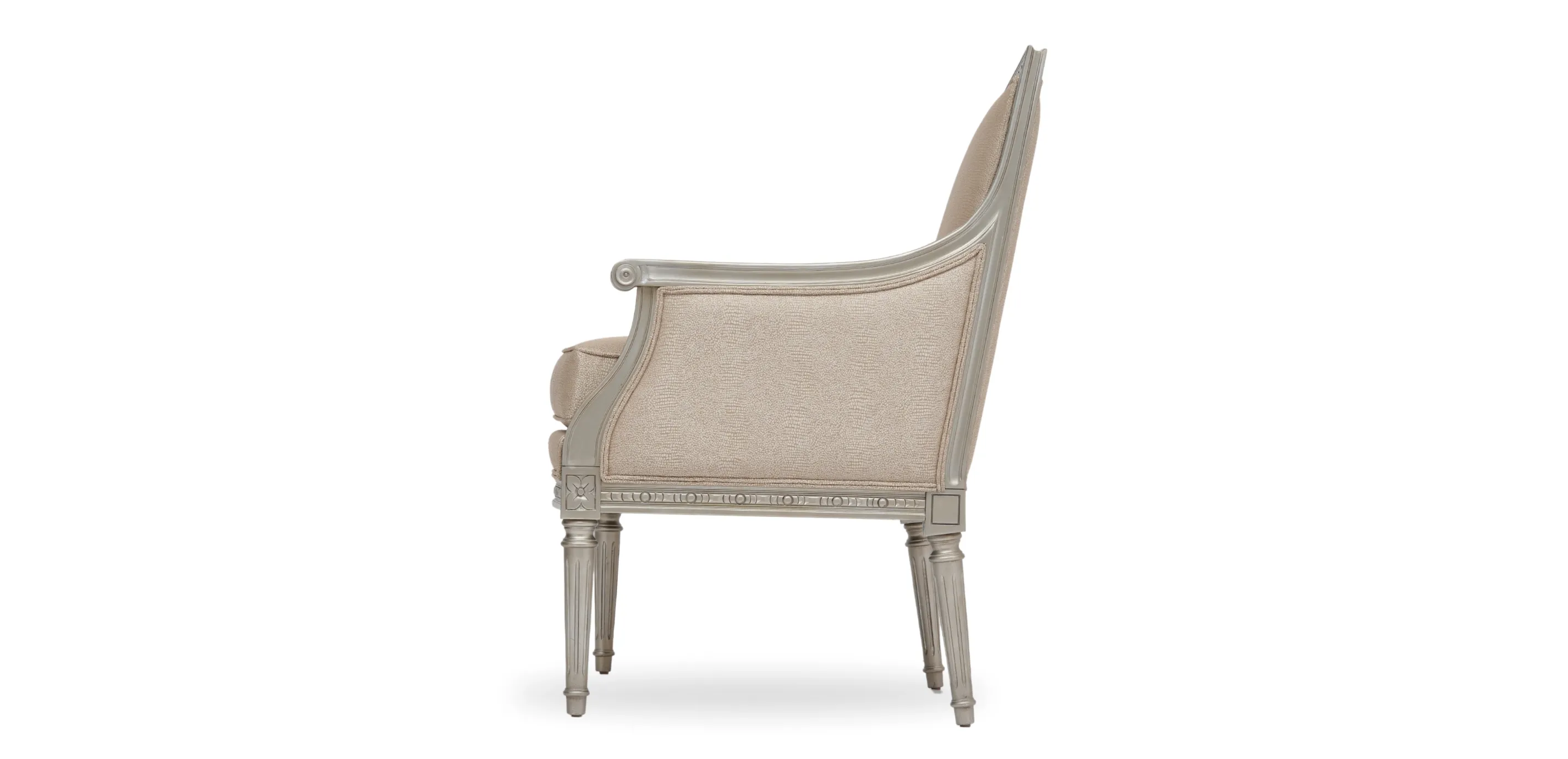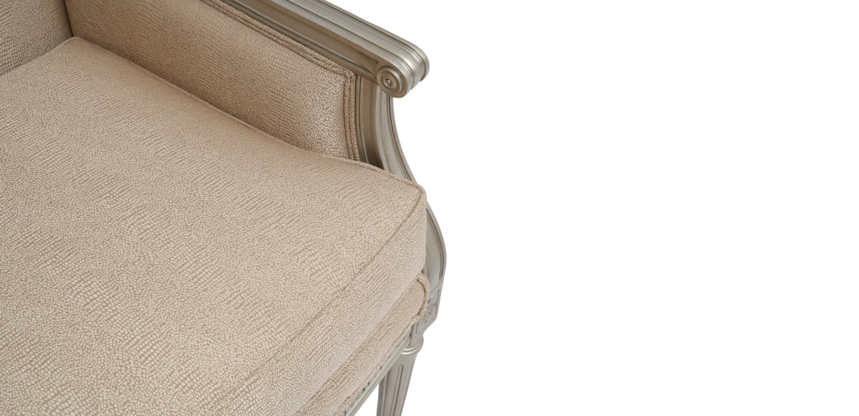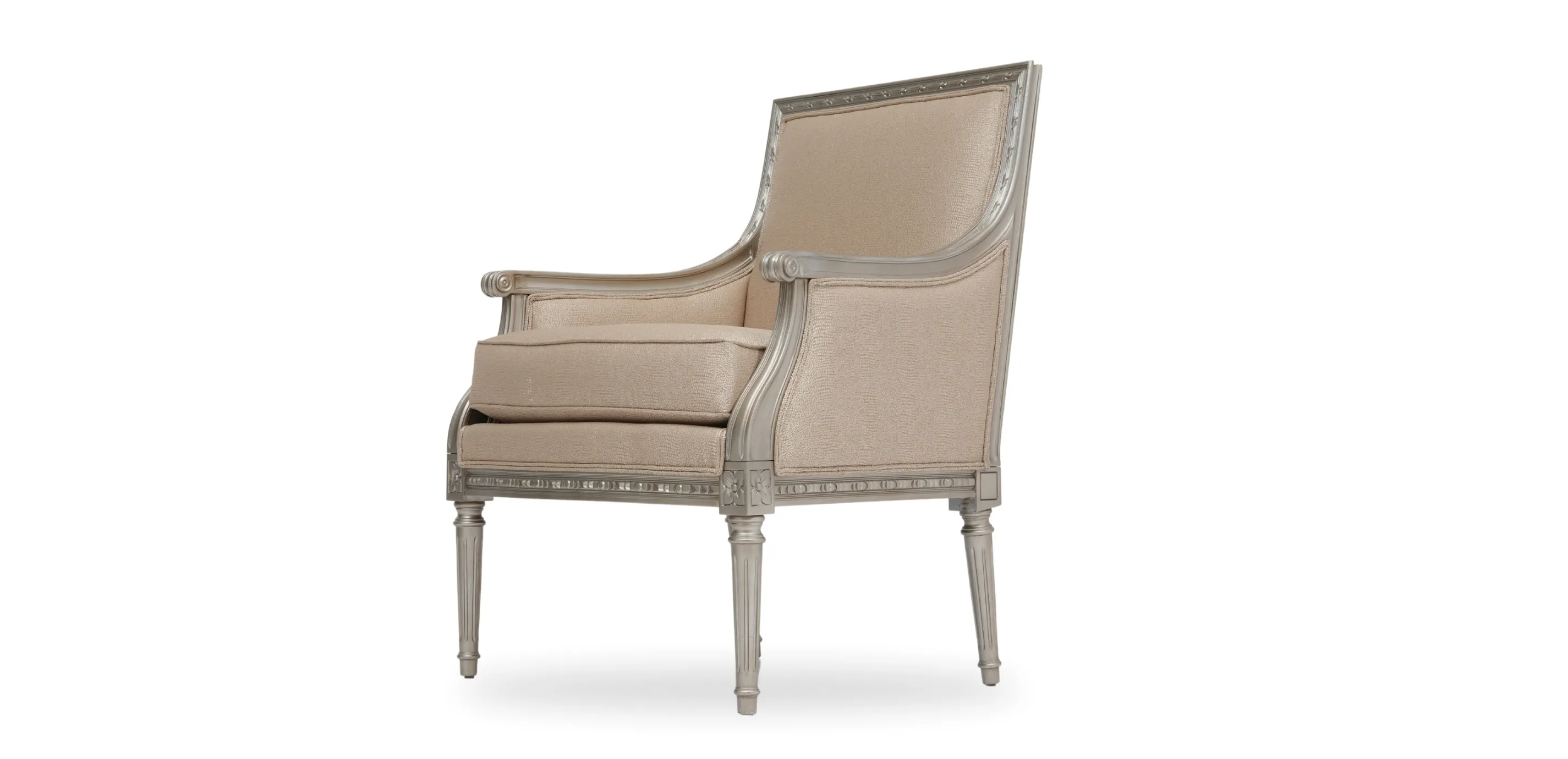 Giselle's fluting, scroll arms, carved rosettes, and elegant turned legs exude Neoclassicism while the sharp linearity of the back makes the chair fresh and modern. Customize it from our impressive array of fabrics and leathers. With its carved wooden frame and fully upholstered loose double welted back and seat cushion, Giselle is a fresh take on a classic chair Poly-wrapped foam cushions provide a soft, structured seat Crafted of kiln dried solid hardwood; available in several water-based finishes Stain-resistant fabric prevents damage from spills; great choice for homes with families and pets Also available in fabric The fabrics and finishes shown here are our most popular, but if you don't see what you're looking for, visit a Design Center to see more opt
