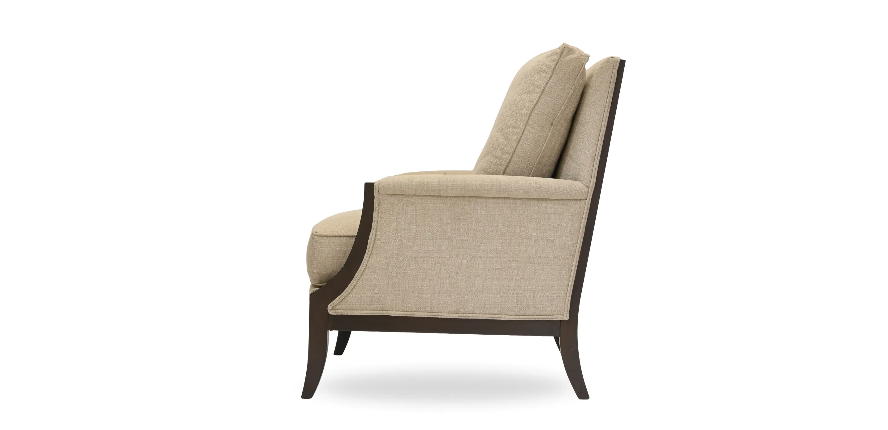Graphically inspired, this chair has an edgy look with its exposed curved wood frame and flared legs, and Chippendale-influenced styling. A comfortable loose back and well cushioned seat ensure it is destined to become a favorite respite.