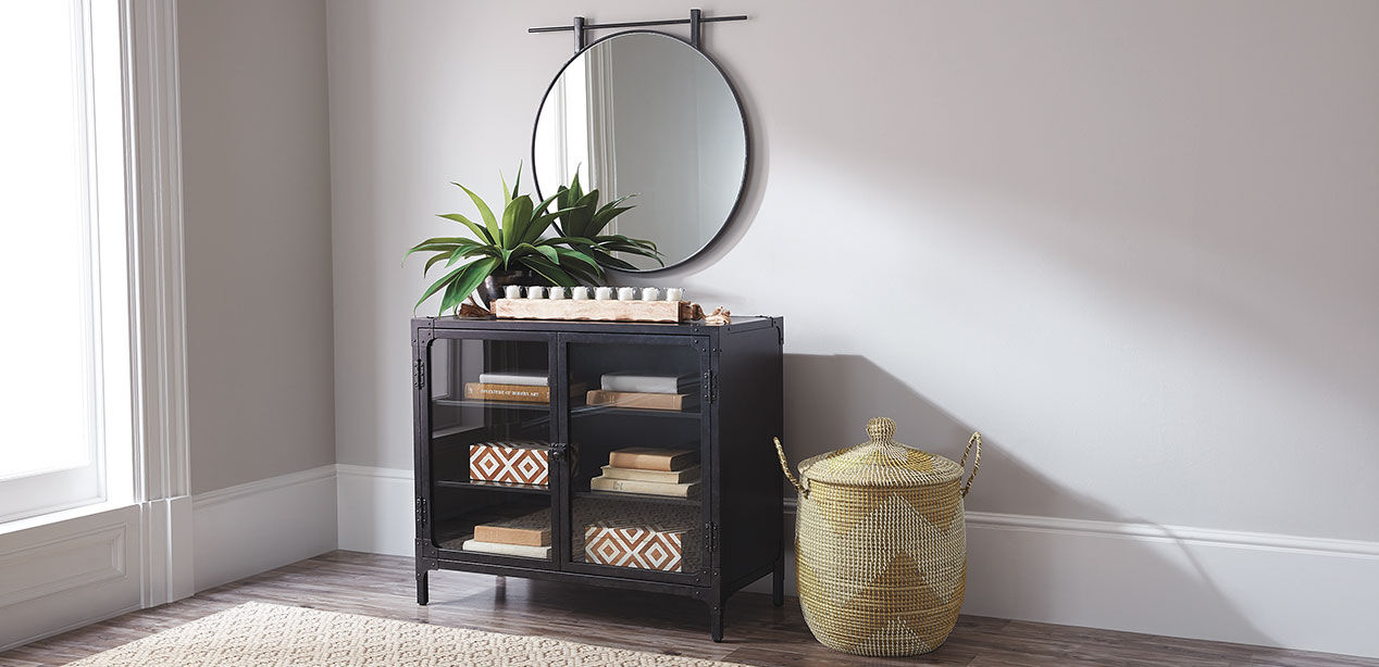 A rustic and industrial partnership for a look you can literally reflect on. The pride of labor shows in the fine construction of metal and glass. Your farmhouse style will go through quite an attractive revolution. Constructed of metal with a charcoal finish, and clear mirror glass Visible mirror dimensions: 29.5" dia. Decorative rod Cleat-style hanging mechanism