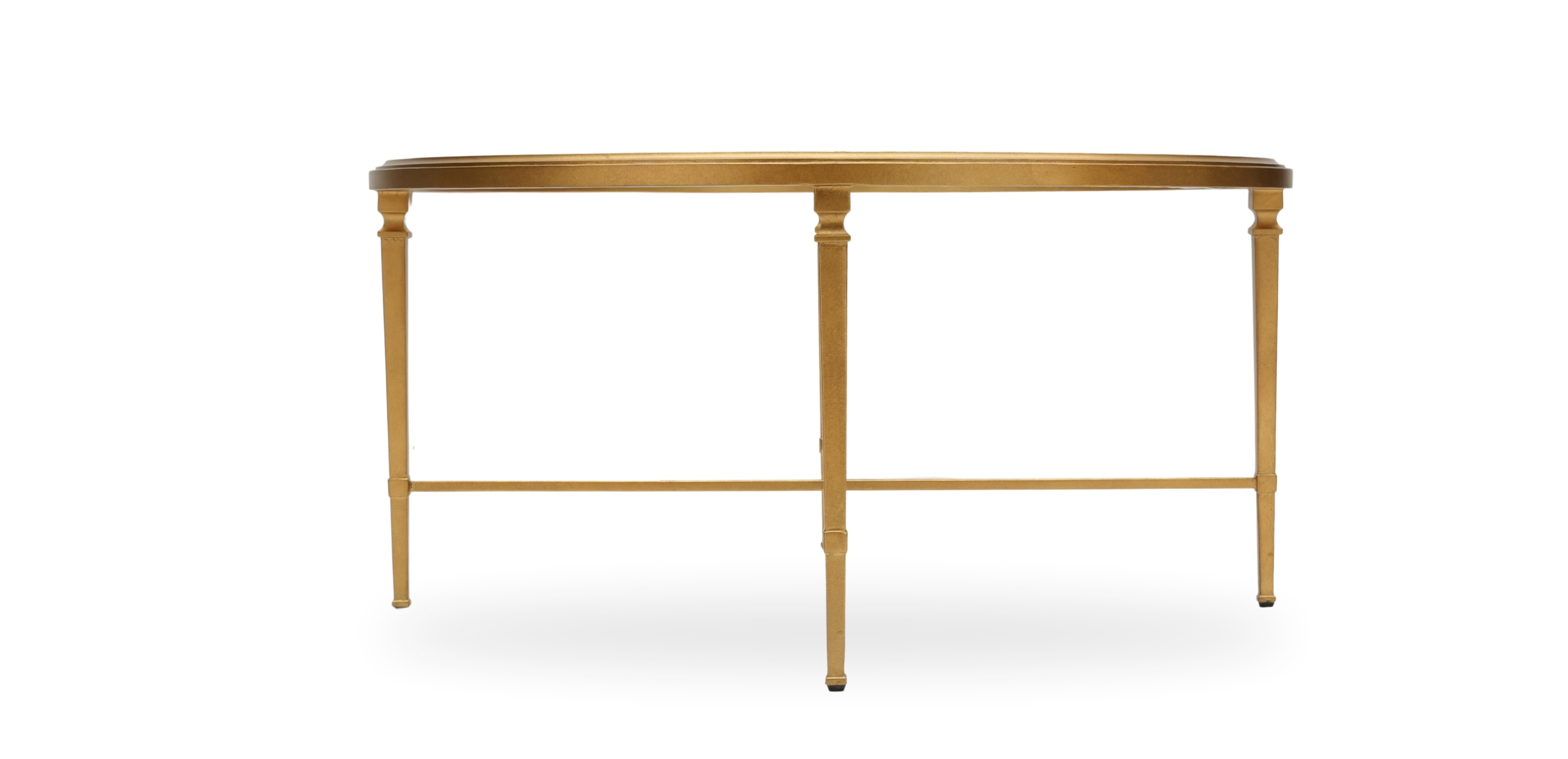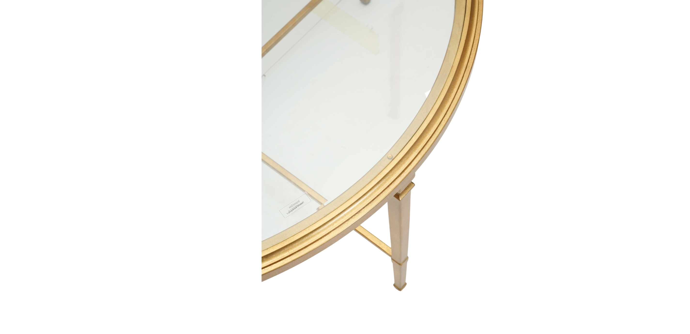 Opulence abounds with this round coffee table, a jewel in any living space. It is sleekly styled with a beveled, tempered glass top and a crisscross stretcher. Delicately proportioned legs create an air of openness. Available in an antiqued silver or gold leaf finish. Crafted from steel with tempered glass* Inset beveled tempered glass top Steel base with decorative antiqued finish