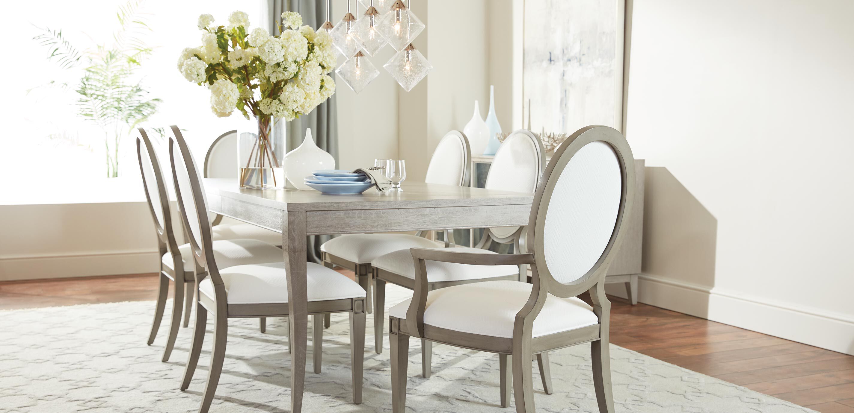 Practical storage for your table linens and dishes, with a heaping helping of added elegance. The Heston mirrored buffet has antiqued mirrored doors, with ring pulls finished in a sleek satin nickel. Behind the left door, you'll find two adjustable shelves for storing plates, decanters, carafes, wine glasses, and more. Behind the right two doors is a drawer lined with tarnish-resistant felt—the perfect storage spot for silver—with another adjustable shelf below. Lovely in the dining room, but also versatile enough to be a mirrored sideboard in your living room, Heston brings relaxed, modern glamour wherever it goes. Skillfully crafted oak frame, with wire-brushed oak veneers* for a casual yet elegant look Buffet with antiqued mirrored doors and elegant ring pulls, finished in satin nickel for a look of relaxed glamour Tapered legs give a traditional design a transitional spin The left door opens to reveal an open storage area with two adjustable shelves The right two doors open to reveal a top silver storage drawer, lined with tarnish-resistant felt, and one adjustable shelf below Available in three on-trend finishes—Gray Flannel (483) and Sea Salt (723)—that coordinate well with other Ethan Allen dining room styles Easy-to-use levelers ensure stability, even on uneven floors