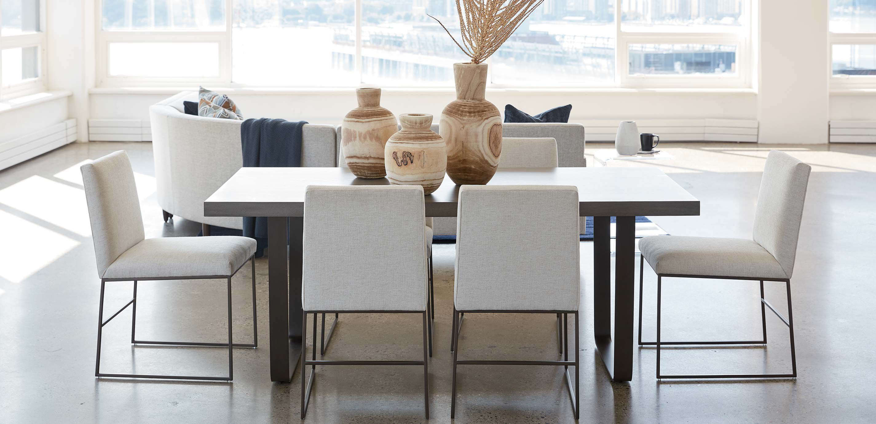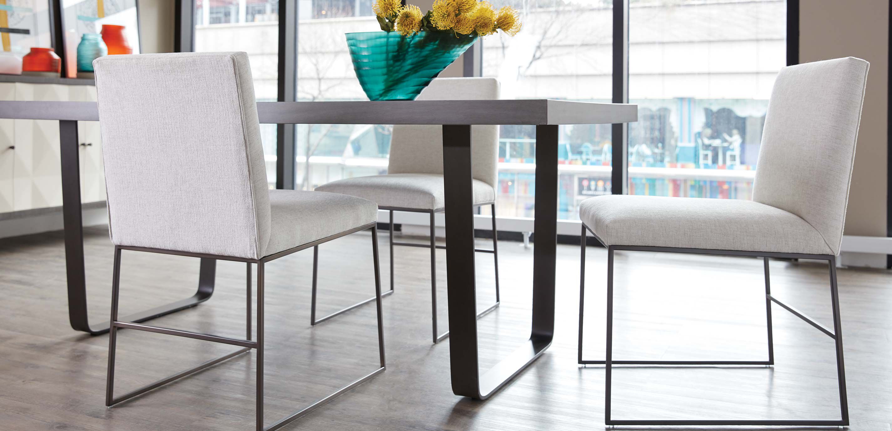 The Jewel mixed materials dining chair is a gem because of its smart, simple proportions and pared-down modern vibe. This slim-back upholstered dining chair gets high marks in both function and form, thanks to a slender profile, tight seat, and tapered back. It’s a good crossover choice for the dining room because it’s airy and understated, a new transitional classic. Sophisticated finish options for this dining chair's metal base (Champagne Brass or Oil-Rubbed Bronze) elevate its industrial influence. Jewel is also available as a counter stool and as a barstool; it’s visually light in any form, so its beauty shines through. Also available in leather. With a tight seat and slim-back, this metal dining chair is both modern and sophisticated Available in two finishes: Brass(895) and Oil Rubbed Bronze (897) and is plated over stainless steel Foam and fiber cushion provides a structured seat Engineered hardwood frame for superior strength and long-lasting durability Stain-resistant fabric prevents damage from spills; great choice for homes with families and pets Available in leather Additional custom options available in Design Centers