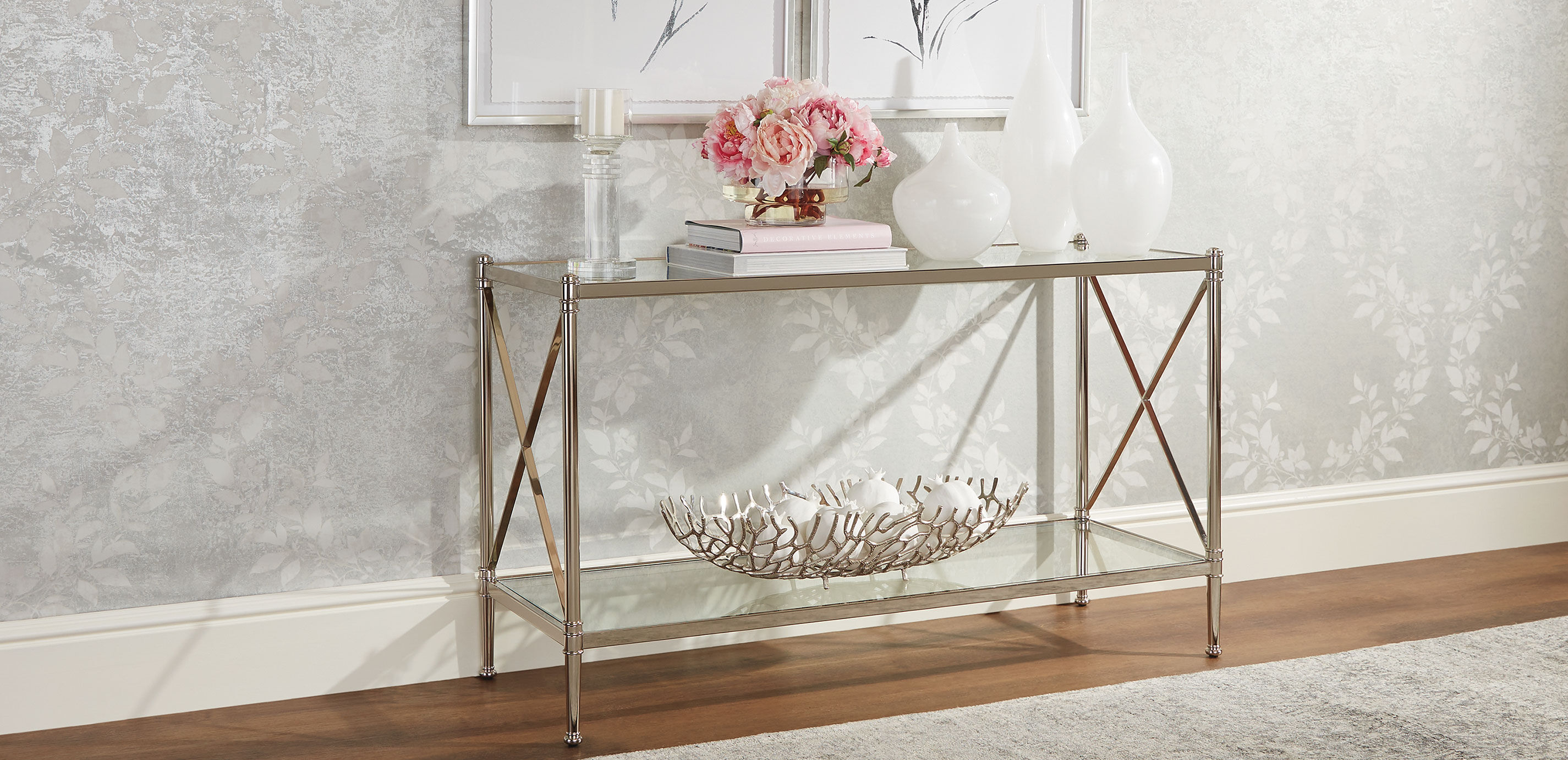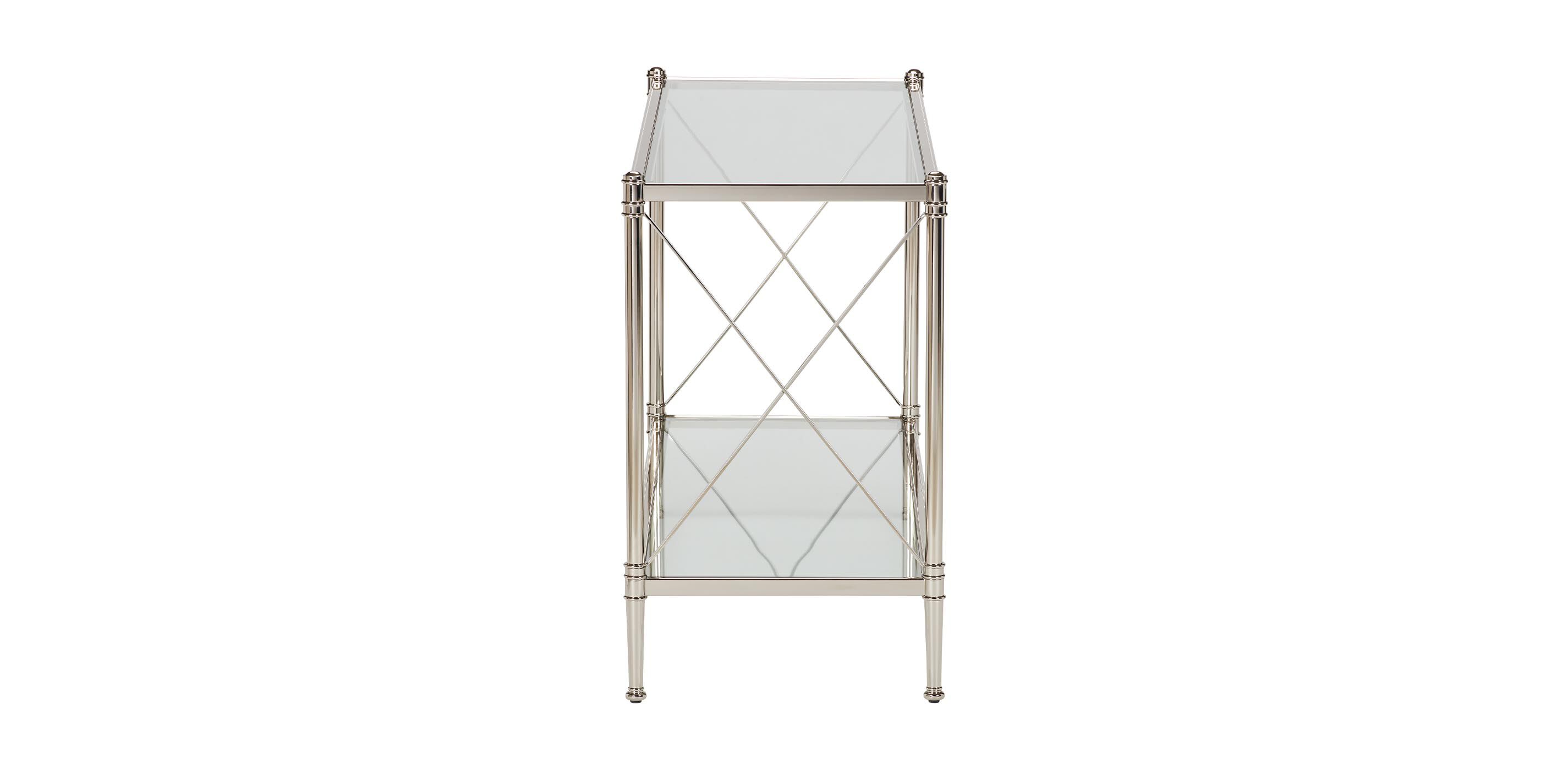 A starlet for your entryway, our Jocelyn console has a glamorous Old Hollywood sensibility. Its X motif has an industrial vibe; its glass top and shelf keep the look nice and airy. Choose a nickel or bronze finish. Metal and glass console table with clear Old Hollywood inspiration; features a dazzling X motif Frame crafted from steel. Shelf and top crafted from tempered glass. Choose from two finishes: Cufflink (115) or Smoky Bronze (145).