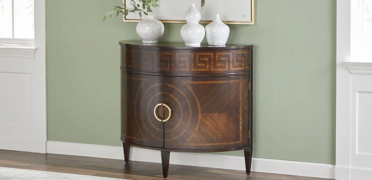 "The Kronos demilune console might have wandered down from Mount Olympus so we could admire its marquetry-crafted starburst top, its bold Greek key elements, and its elegant form. Beyond its otherworldly beauty, Kronos has a functional side, too; its roomy interior is a pleasant and practical surprise. A heaven-sent petite demilune console like Kronos proves you don't have to go big to deliver spectacular style.