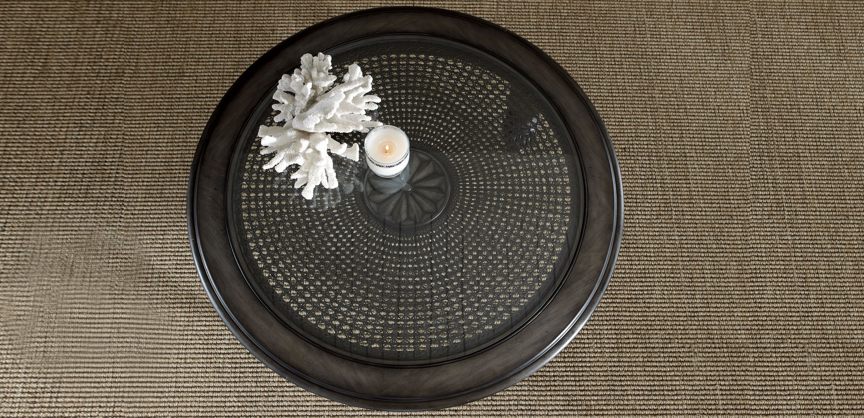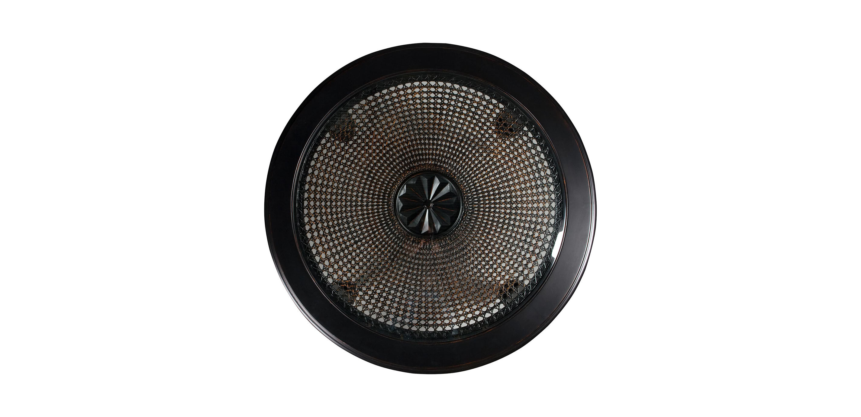 Such a practical and unusual shape! This round table it conveys a relaxed island feeling and encourages conversation. The table’s hand-woven cane top has a solid wood carved center rosette. The tabletop sits on four bold hand-carved legs with petite ferrules. The workmanship: impeccable. Crafted from mahogany wood solids with mahogany wood veneer lamination; weaving rattan splits* Inset beveled tempered glass top Hand-woven cane top with hand-carved solid wood rosette Beaded apron with turned rosettes above each leg Hand-carved legs with ferrules and reeded baluster