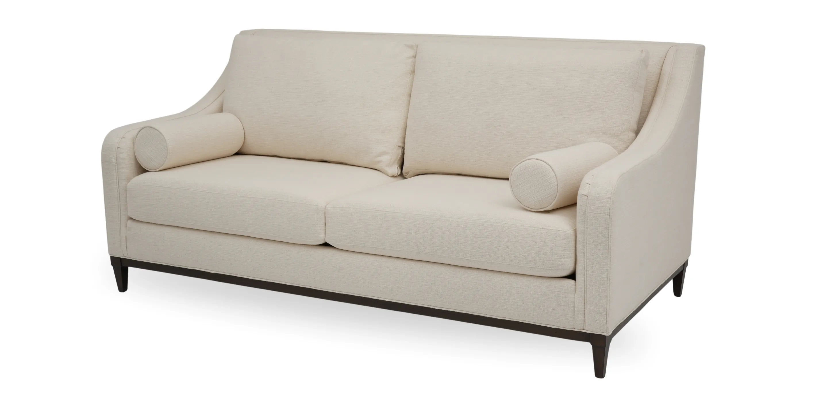 A modern sofa that features sloped arms, loose cushions, and a sleek exposed wood base. Two bolster pillows included.