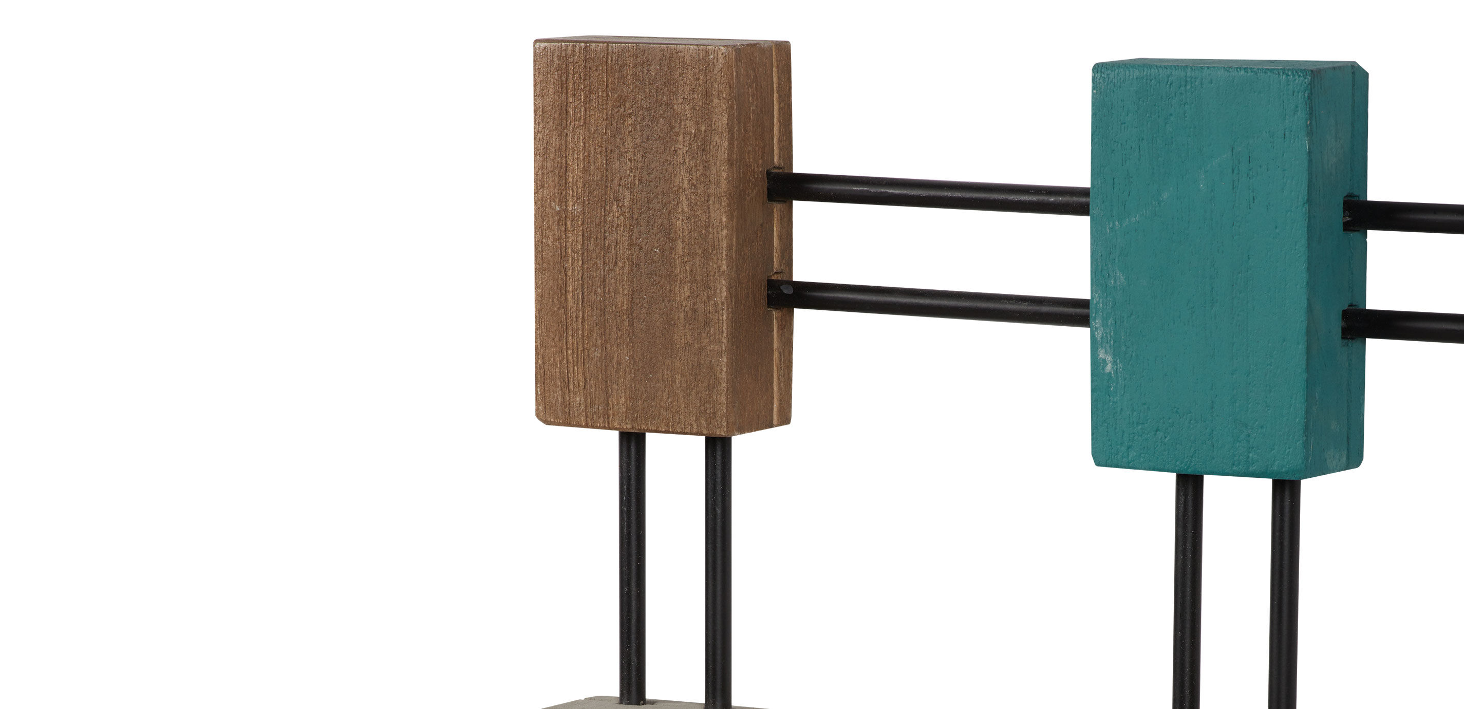 This eye-catching iron and wood wall art delivers a unique look with a retro-modern vibe; all wood elements are connected by a graphic iron grid. Choose from either multicolored or natural wood wall sculpture blocks—or hang both sculptures for a contrasting look. Then, hang this mango wood and metal wall art above a sofa, bed, or mantel to add dimension, visual interest, and an artful touch to any room. Constructed of iron with mango wood Available in natural wood finish or in painted blue, gray, and turquoise wood finish Black matte iron finish Can be hung vertically as well as horizontally