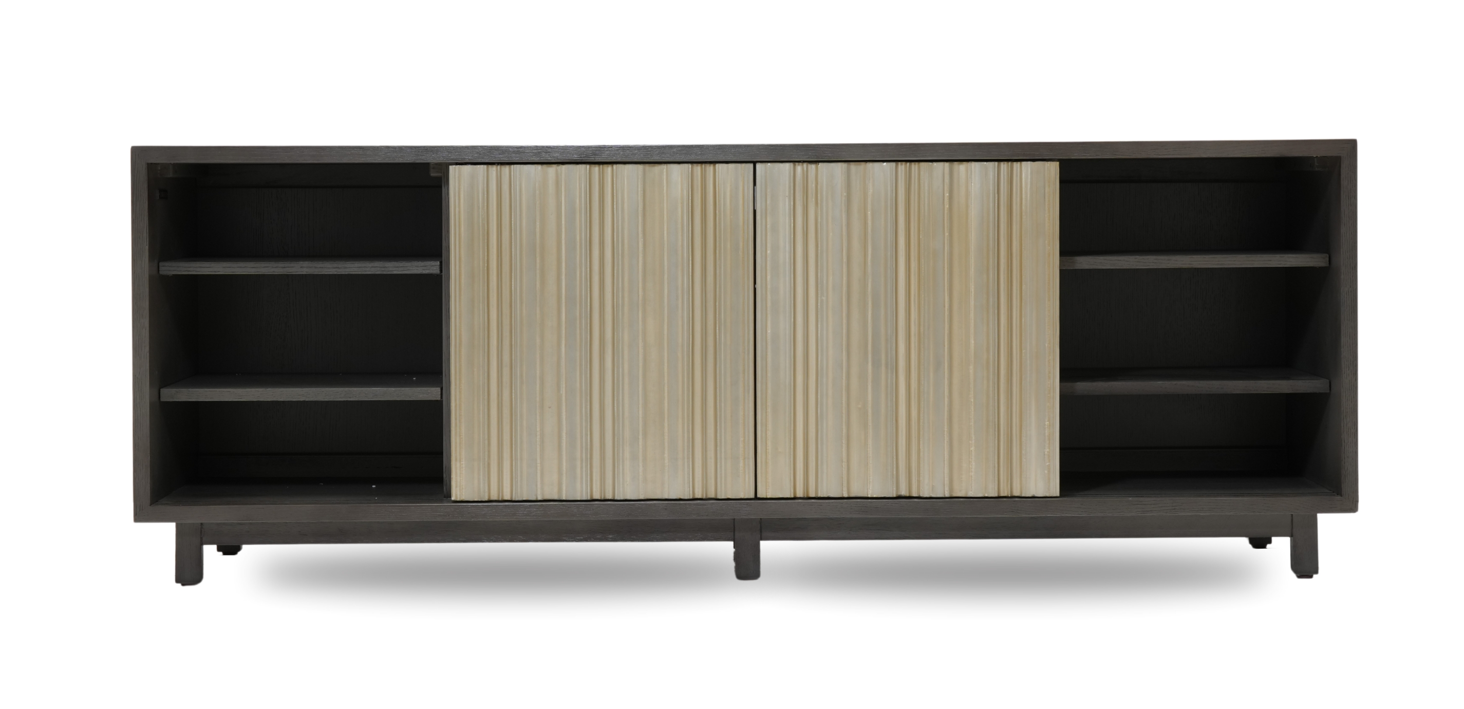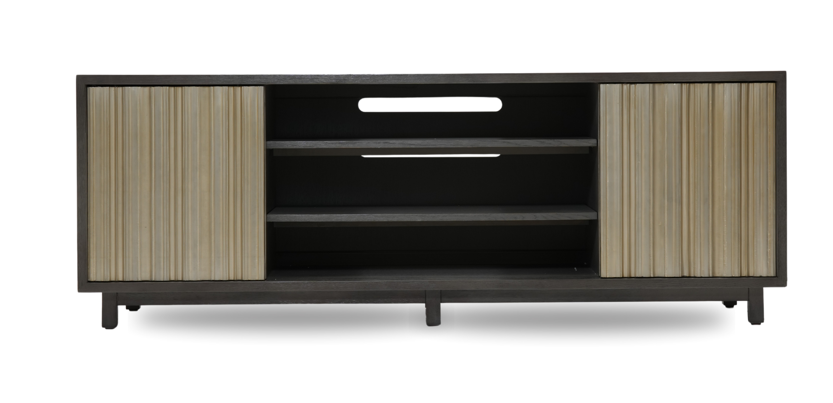 Our modern midcentury Braswell entertainment cabinet was made for the here and now. Horizontal slats create visual appeal and allow remote controls to do their work --- without you having to open the doors! Midcentury-inspired media cabinet crafted from solid oak with select oak veneers* Remotes can be used without having to open slatted doors Recessed support for sound bar storage Modern mid-century design crafted from solid oak with select oak veneers