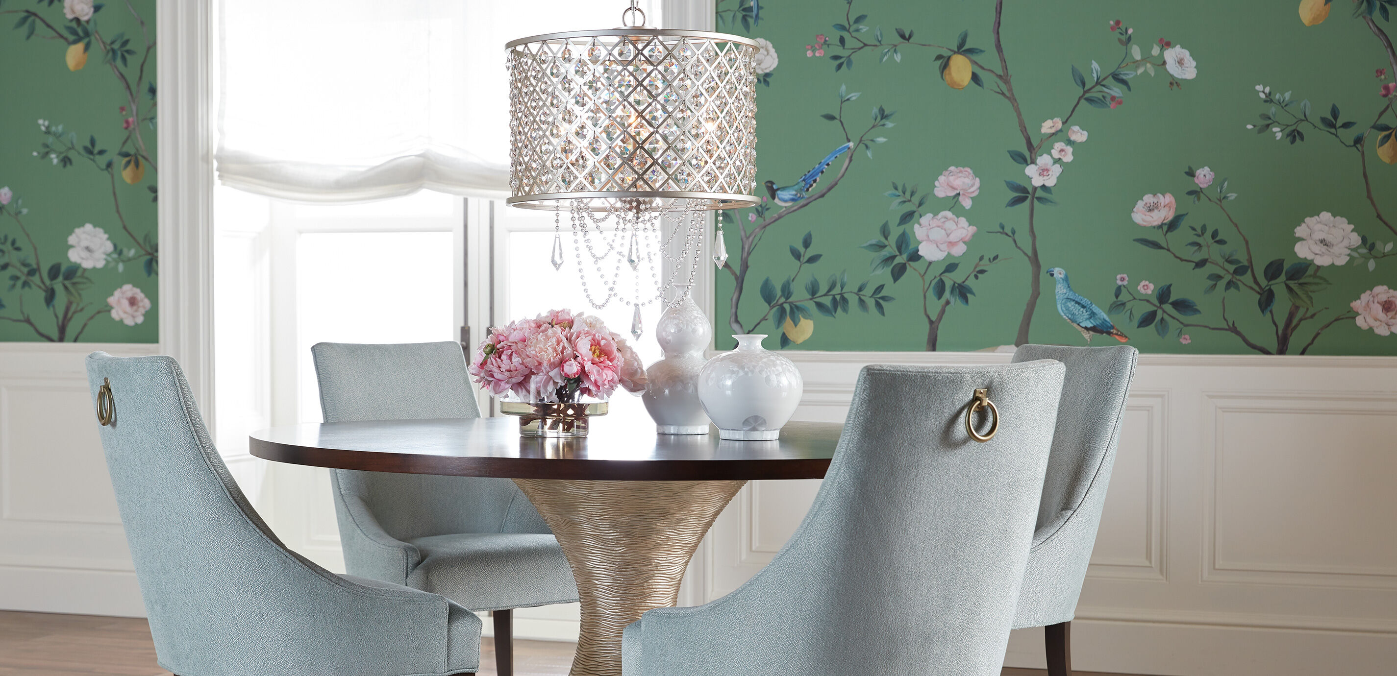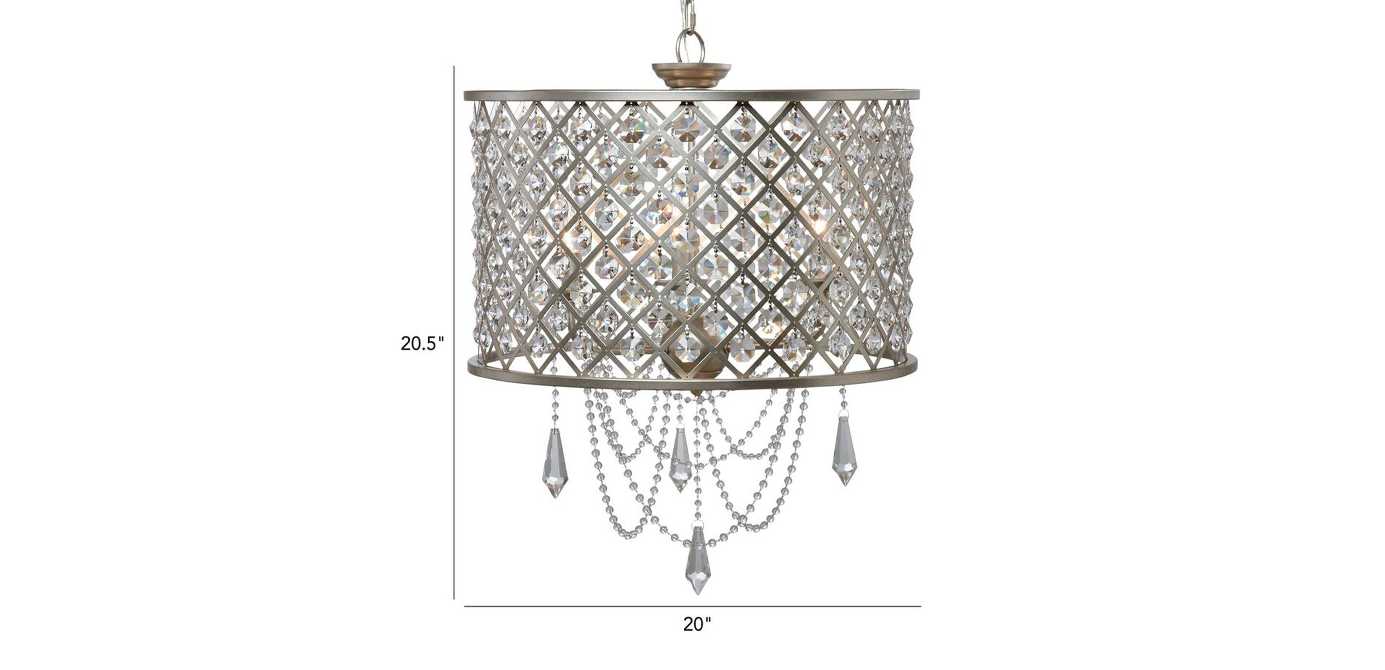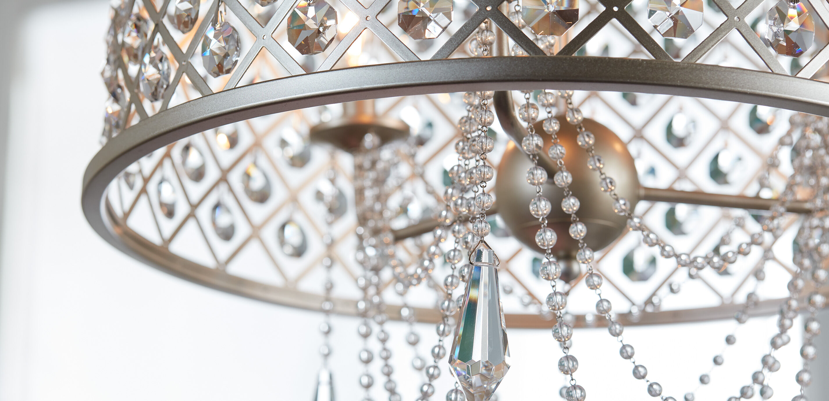 Our Antoinette features a modern metal drum with a lattice pattern made even more captivating with elegant hanging crystal beads and teardrops accents. The light it casts in a room is simply mesmerizing.