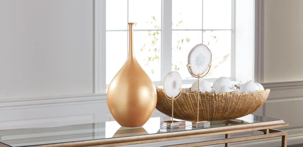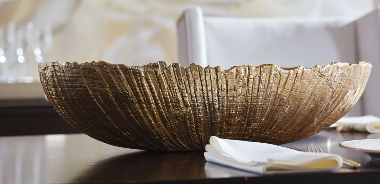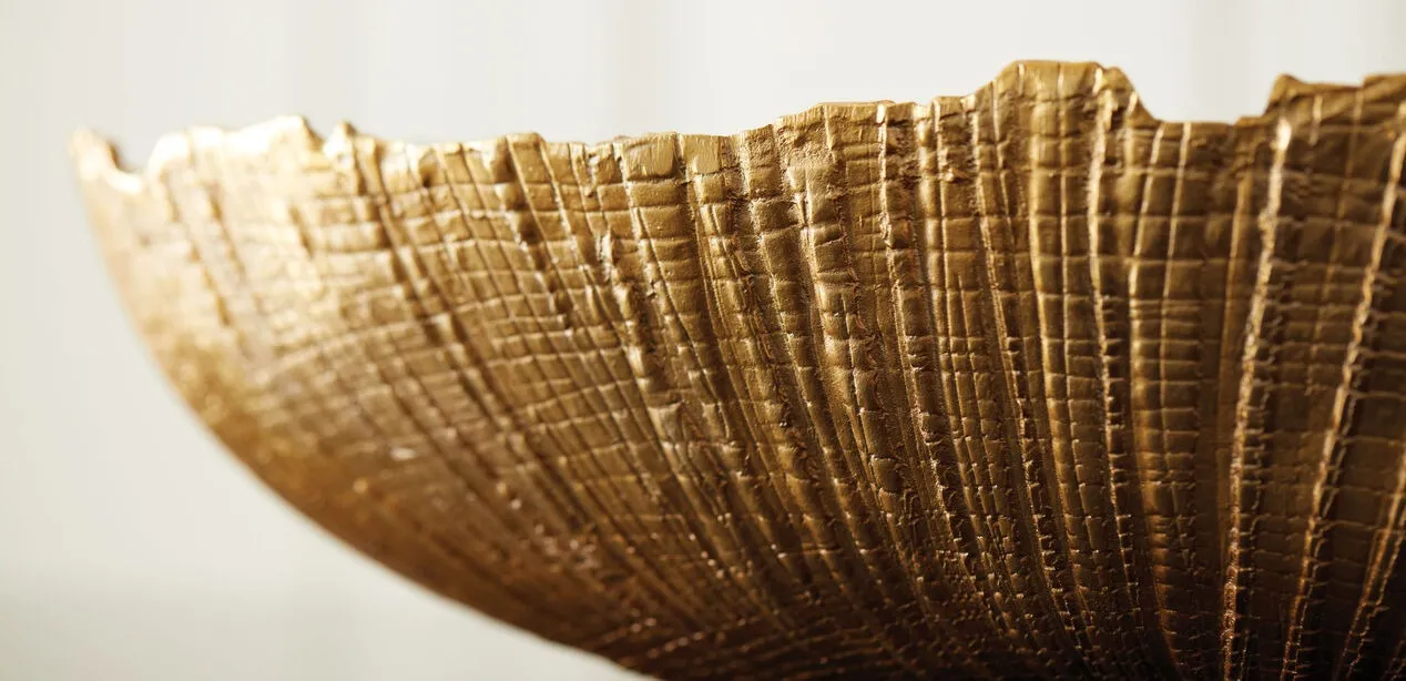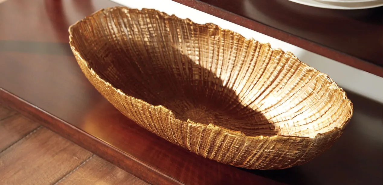 Handcrafted and naturally inspired, each Tanzia decorative metal bowl gets its incredible inside-and-out detail from a technique called sand-casting. Artisans create 3D molds from sand, into which they pour molten aluminum. Once the parts are made, the artisans fit and weld them together before applying a luxurious metallic finish. Complete your tablescape with our coordinating Tanzia tray.
