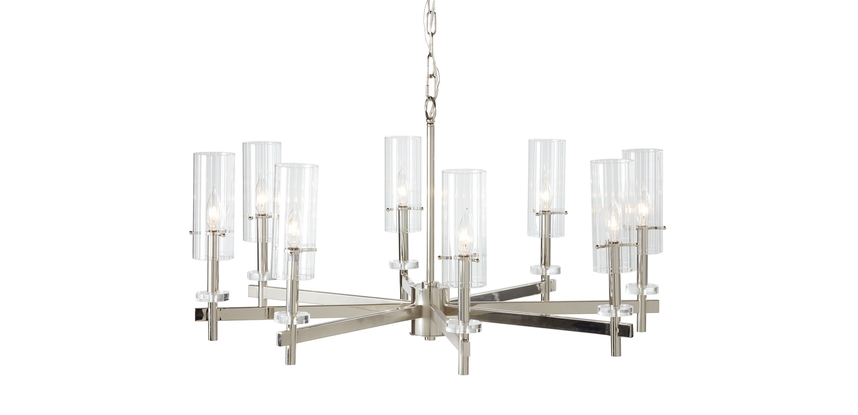 The Tiberius chandelier's glass shades feature crisp cuts for just the right amount of visual interest and come in your choice of one or two tiers. Each arm holds a glass puck-candle cup. Our Tiberius chandeliers blend glass and metal to create a modern, minimalist way to light up a room Frame: crafted from steel with polished nickel finish Clear ribbed glass shades Canopy detail: 5" dia., polished nickel Two-tier uses twelve 2.2-watt LED candelabra bulbs. Single-tier uses eight 2.2-watt LED candelabra bulbs. Ships with 13' of wire and 6' of chain Hardwire only; professional installation recommended Click to view the Tiberius lighting collection.