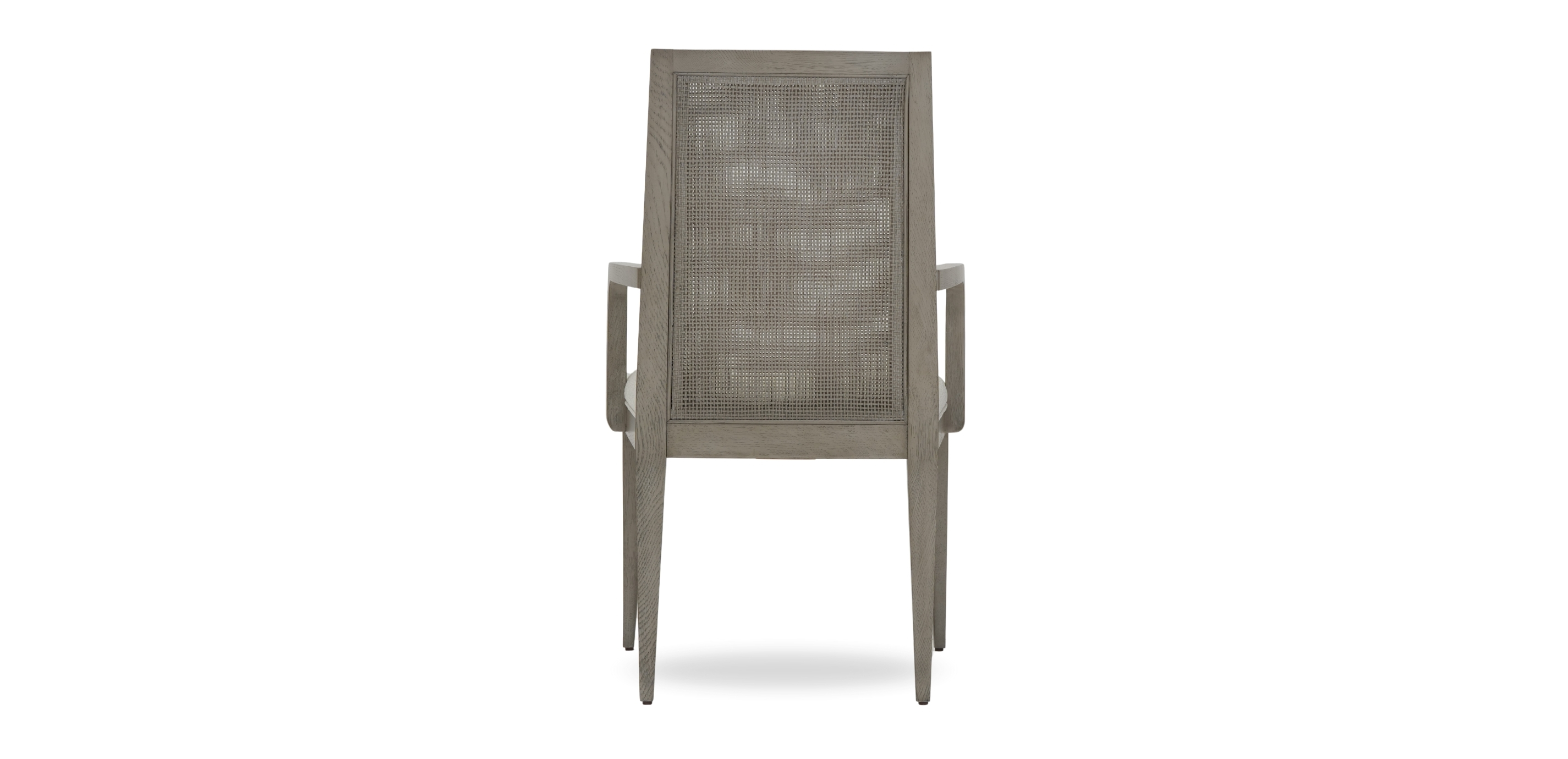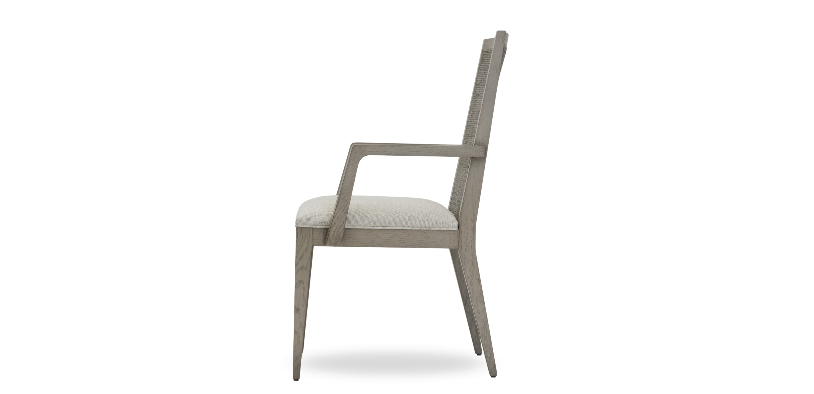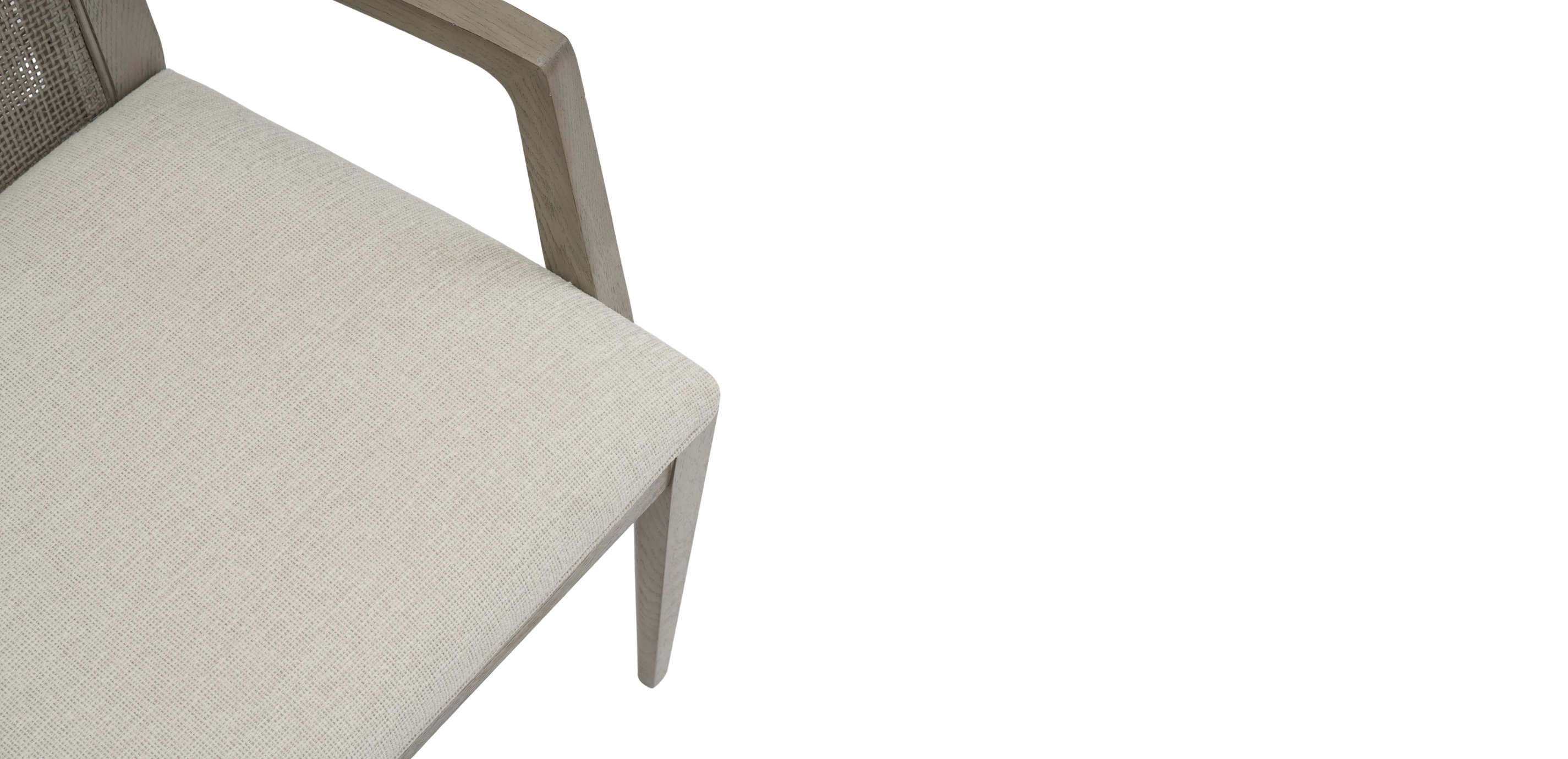 Usher in a new era of casual dining perfection. This clean, contemporary oak-frame armchair has a finish that our artisans wire-brush by hand to bring out the wood grain. A pair of welcoming arms surround a cozy cushioned seat, inviting you to linger over dinner (and definitely have dessert!). The chair's woven back, crafted from sturdy rattan, adds texture and a healthy helping of nature-inspired appeal. An oak-frame armchair for casual dining, with sleek lines and a striking woven back Gorgeous oak frame has a wire-brushed finish to bring out its wood grain Woven back crafted from sturdy rattan for a look that's both durable and beautiful Cushioned seat can be upholstered in a range of performance fabrics to resist spills and stains