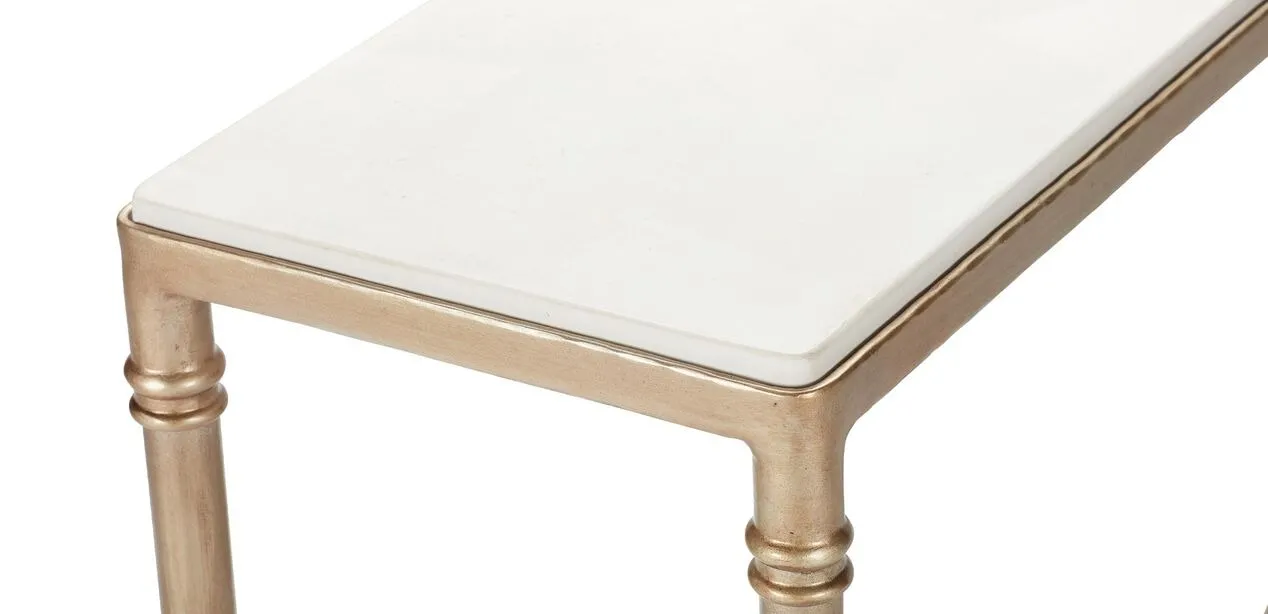 Mixed-material console table. Polished white agate top with hand-cast metal stretcher base.