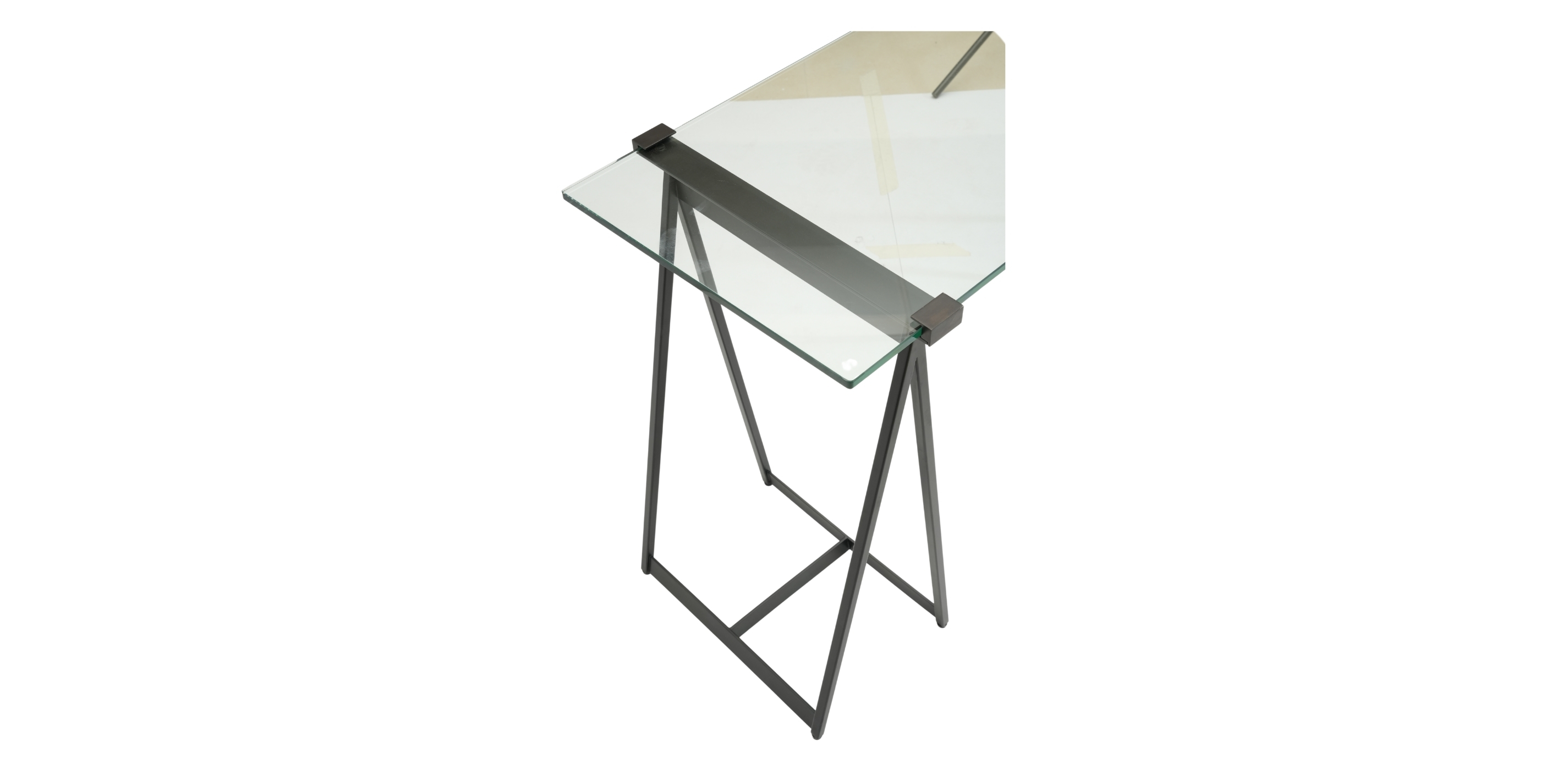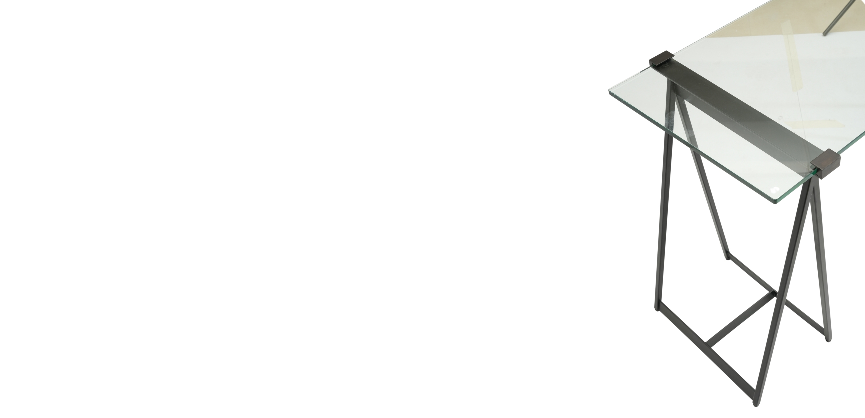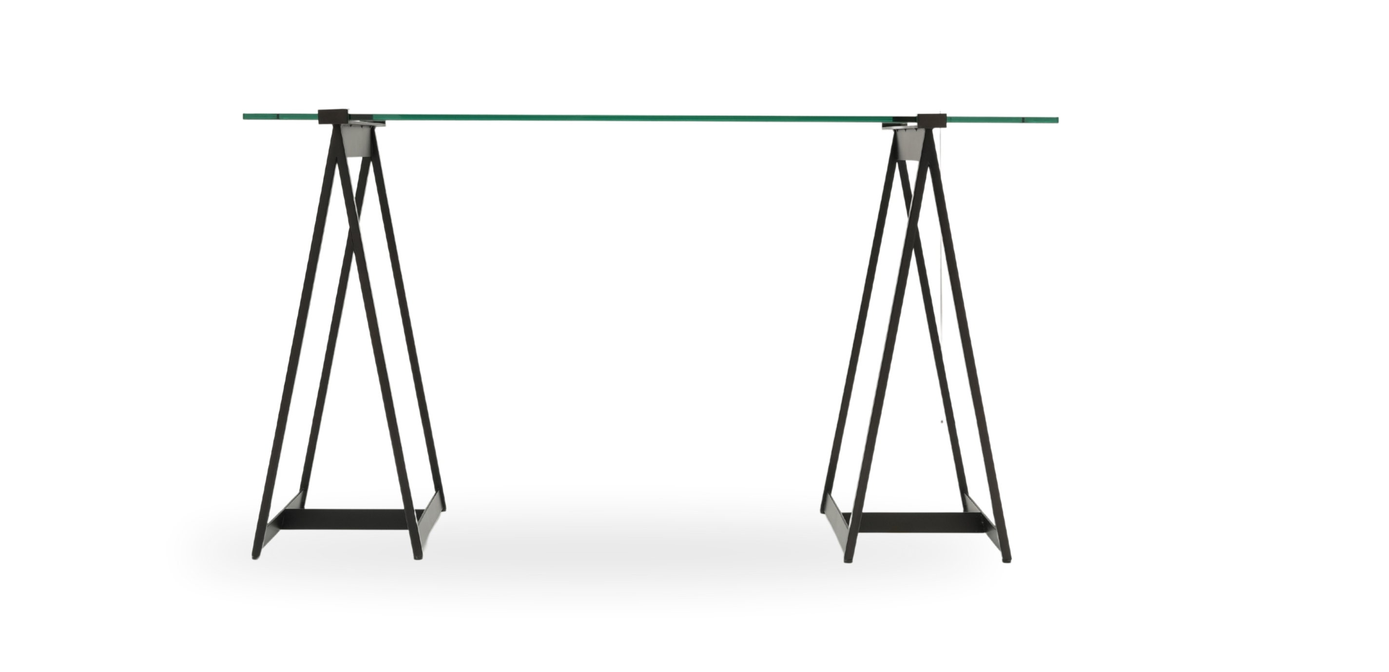 We streamlined the classic, utilitarian sawhorse design, gave it a modern spin, and voilà!—the Verena sawhorse desk! Verena is chic, minimalist, and versatile enough for any room setting, and we'll let you in on a secret: This fabulous glass and steel sawhorse desk makes a striking console, too. It features mild steel pedestal bases and a tempered glass work surface, with pencil polished edges for safety and distinctive style. Metal clips, part of the glass-top sawhorse desk's base design, provide added stability. Crafted from steel and tempered glass Tempered glass top with pencil-polished edges Metal clips designed as part of the base hold the glass in place and provide stability Distance between the two pedestals is 28.5" Easy-to-use levelers ensure stability, even on uneven floors