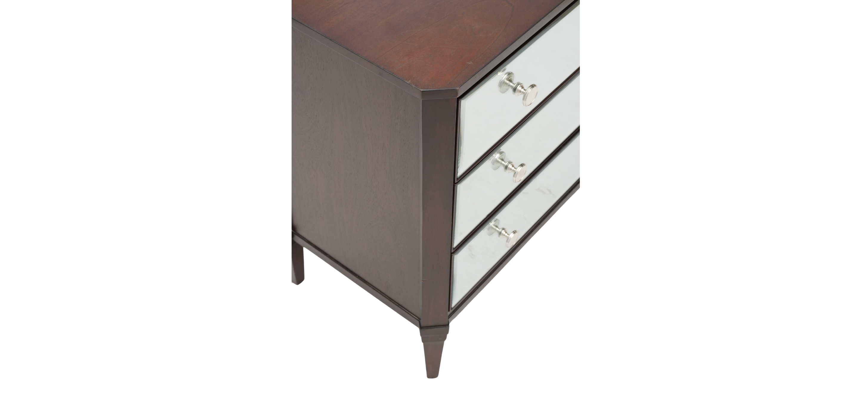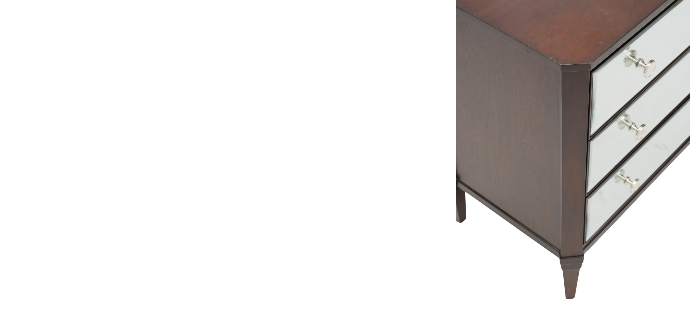 Who’s the fairest of them all? Our Veronica chest, naturally, with antiqued mirror panels that lend a touch of whimsy to any interior. The silver leaf wood frame and mirrored knobs create a subtle, ethereal sheen. Crafted from antique mirror glass inset into Asian hardwood* Three drawers. Features antiqued mirrored top, sides, and drawer fronts Silver leaf wood frame, legs, and back panel and silver leaf knobs with round mirrored insets Antiqued mirrored top, sides, and drawer fronts